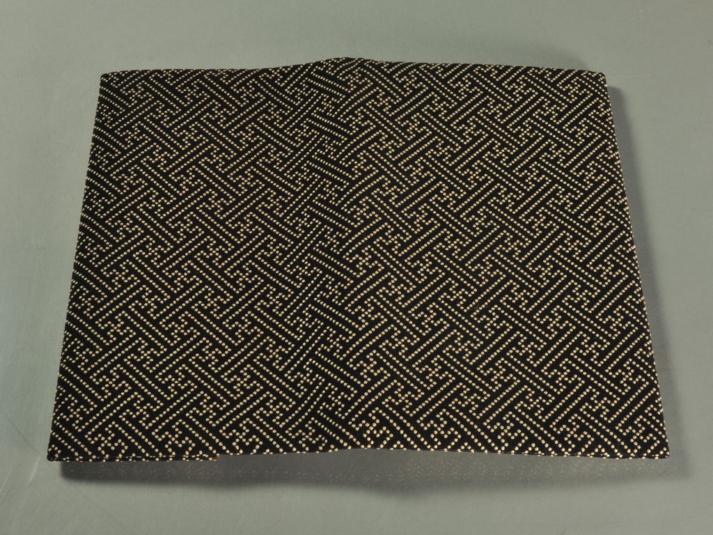 伝統の印伝(いんでん)とは、鹿などの皮をなめした素材に漆(うるし)で模様を描いたものです。この商品は、スエード調の生地にそれを模した加工をほどこし印伝調に仕上げたものです。柄の部分は少し盛り上がっています。