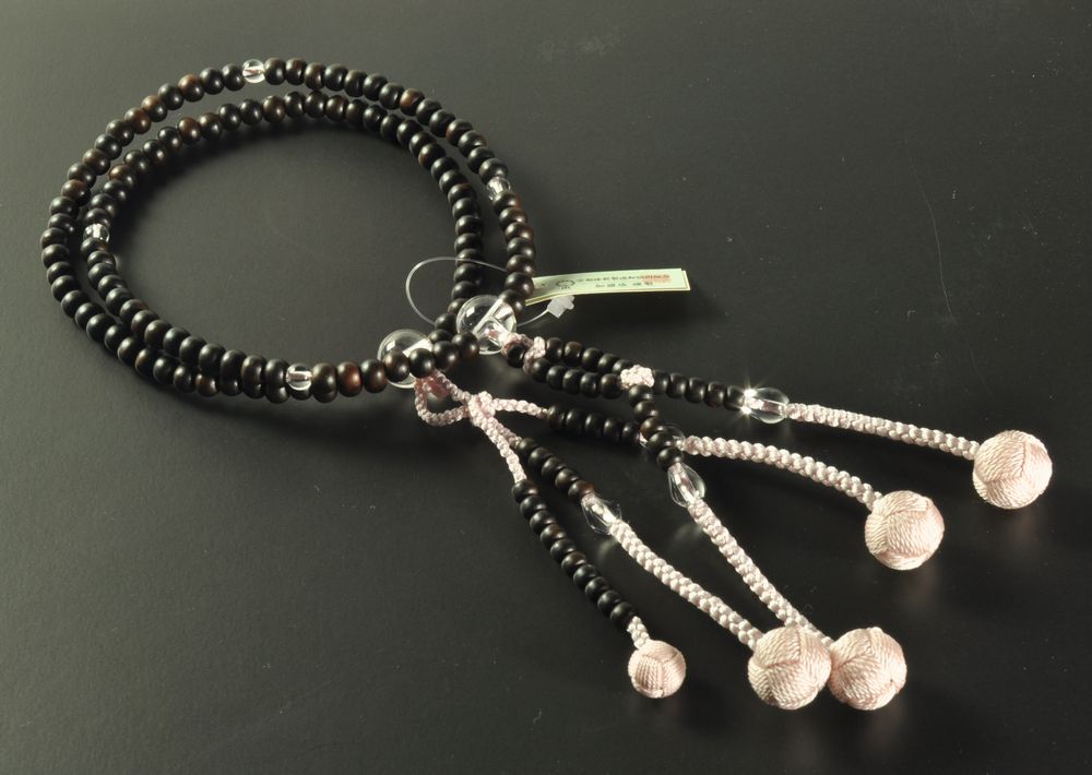 縞黒檀では暗めになりがちですが、明るいピンクの房を付け、水晶で仕立てることで女性らしい数珠に仕上げています。