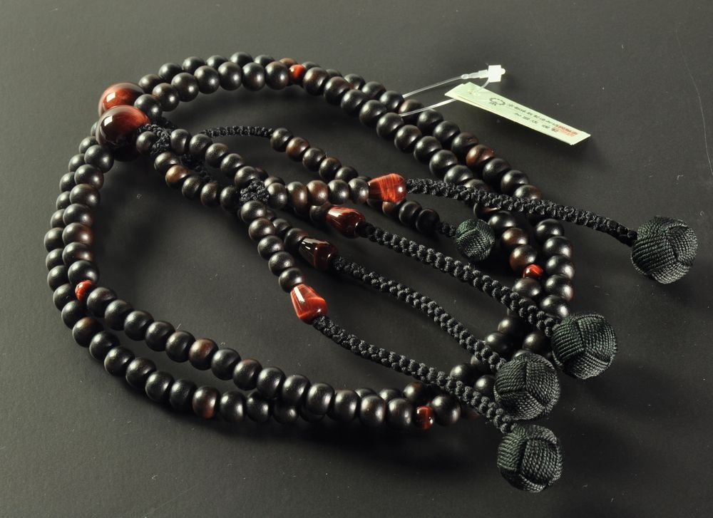 日蓮宗用の念珠(尺寸サイズ)です。オーソドックスな縞黒檀に宗派用としては珍しい赤虎眼石を合わせました。黒い房を合わせ、引き締まった印象です。