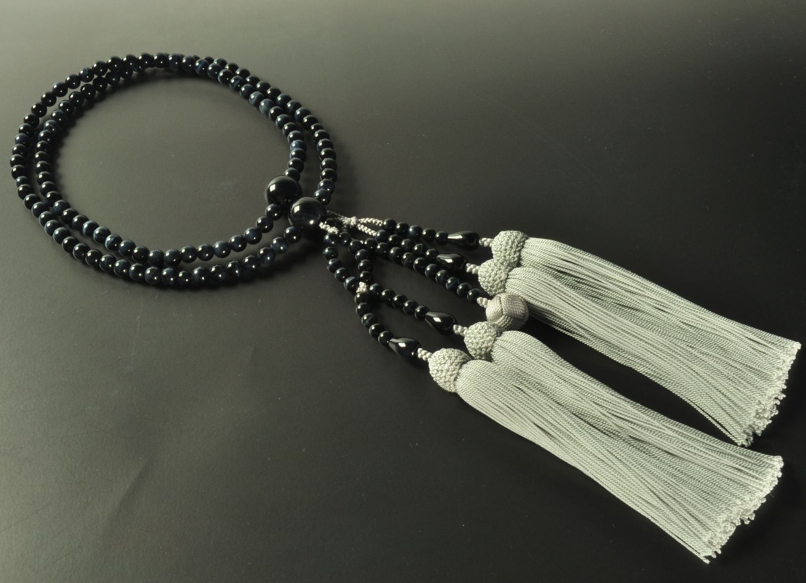 尺二寸サイズの日蓮宗用男性念珠です。高級感のある青虎眼石に、ねずみ色の導師房を合わせました。