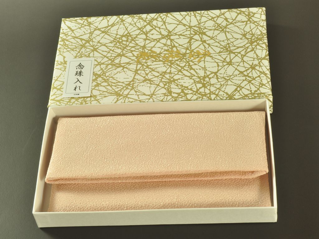 無地・薄桃色のちりめん生地の日本製念珠入れです。留め具はなく、そのまま折りたたむシンプルな袋です。
