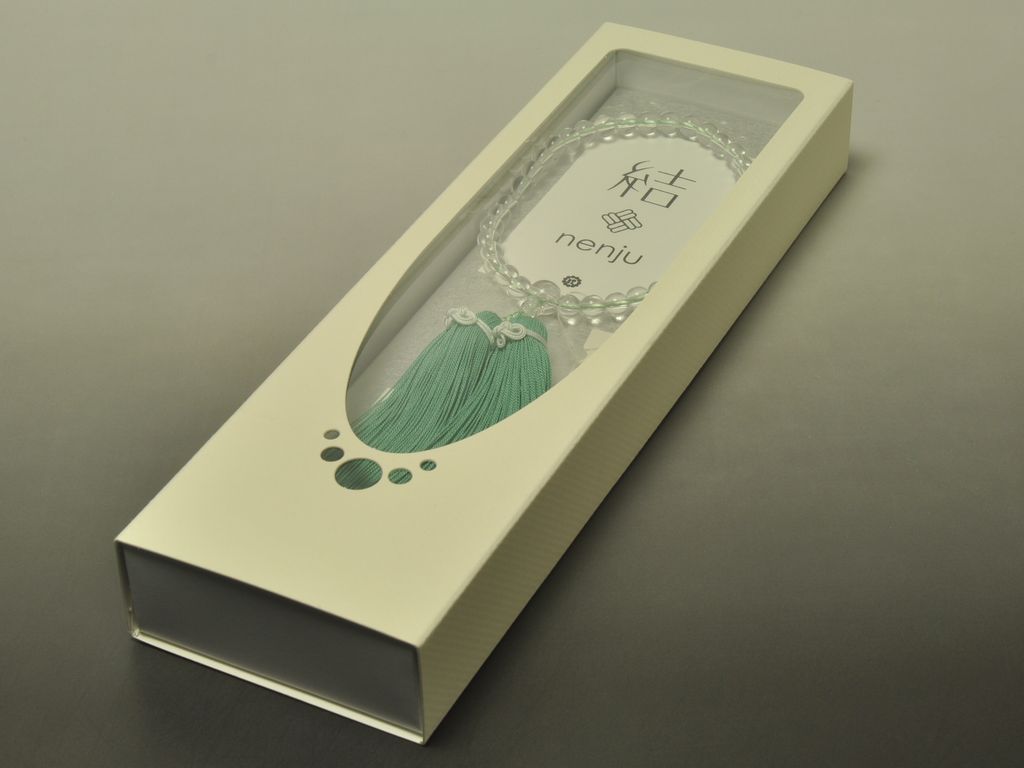 珠数製造卸として100年の歴史を持つ神戸珠数店が「祈り」の思いをテーマに作った、女性のためのお数珠です。身の回りを清めるといわれる水晶玉と、願いが叶うお守りの意味が込められた房を組み合わせた、女性らしさが引き立つやわらかいデザインです。