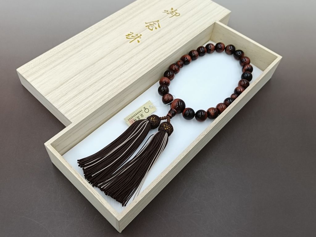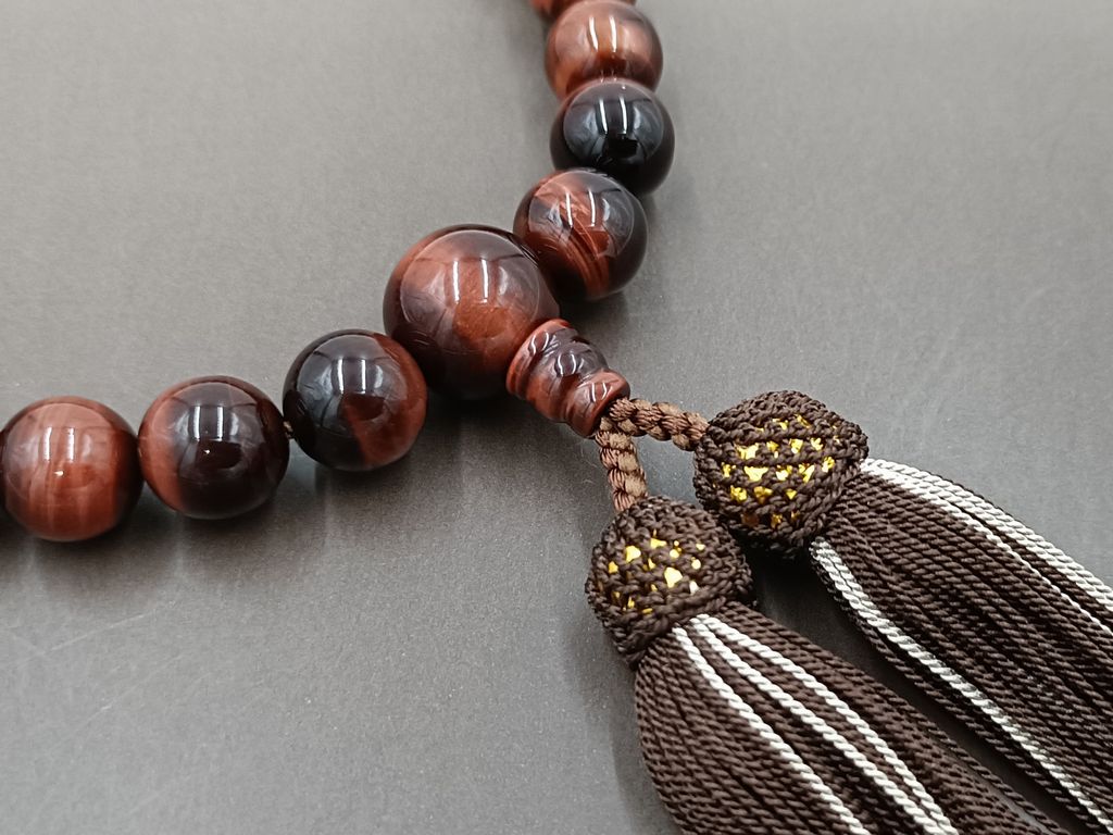 赤虎眼石で組んだ数珠です。独得の光り方が人気の石です。焦げ茶色の房とで温かみのある色合いとなっています。