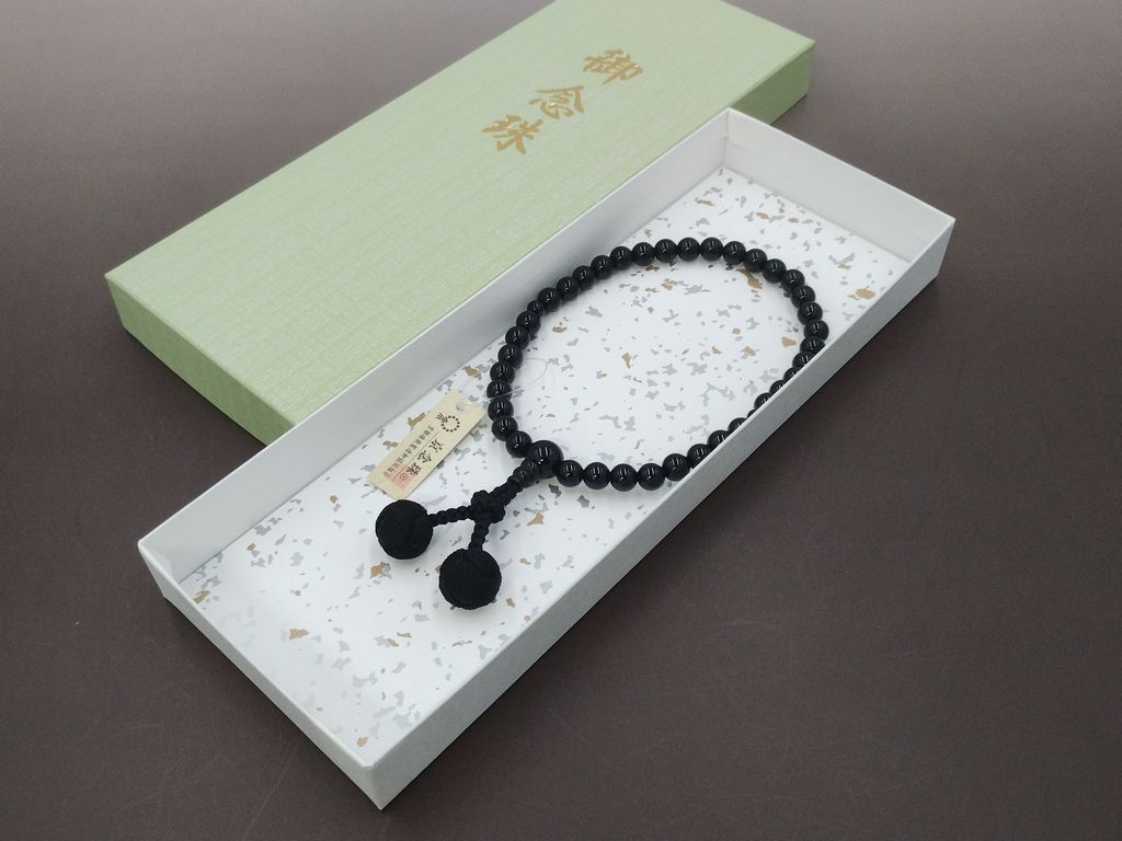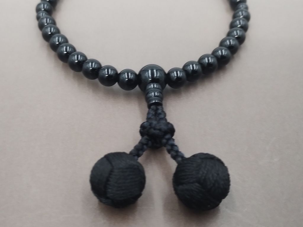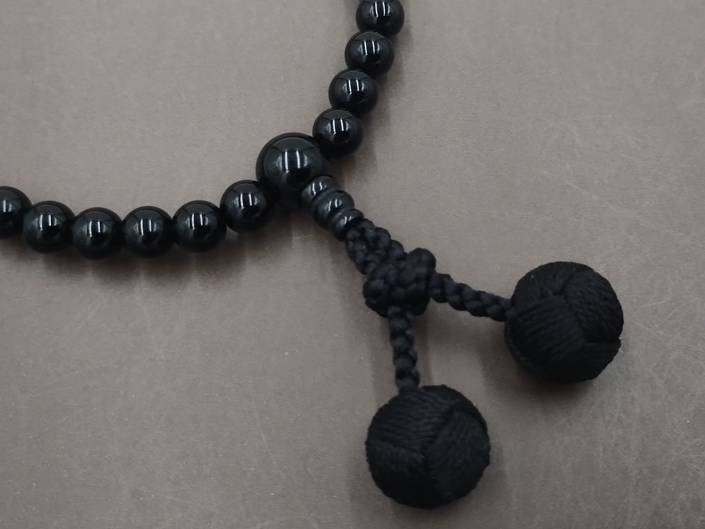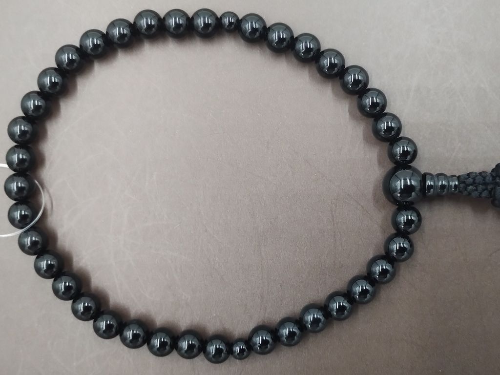 黒でまとまった数珠です。玉の素材は、若干落とし、その分のコストを抑えています。