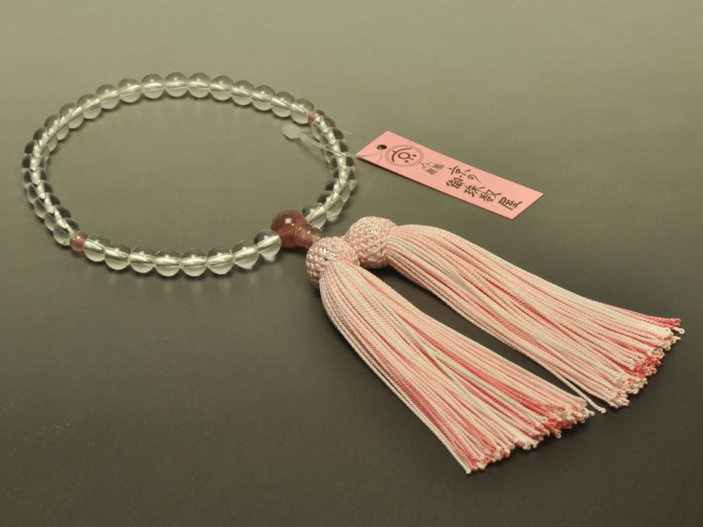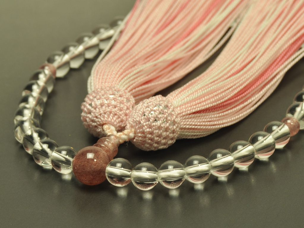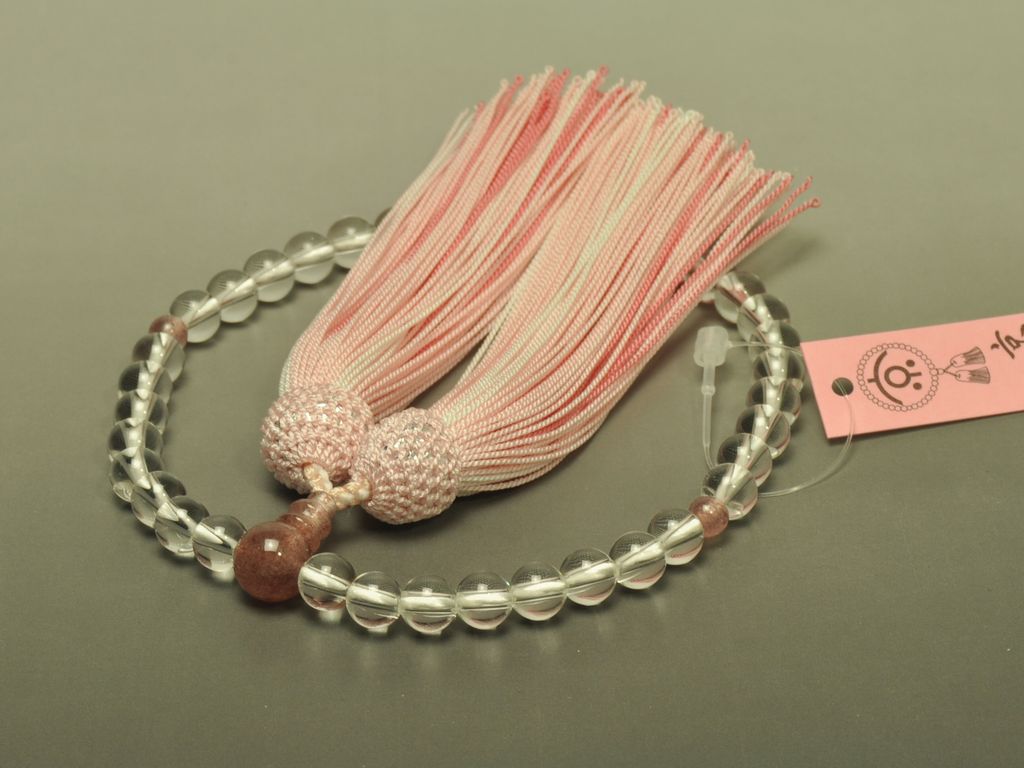 水晶の主玉にストロベリークォーツを合わせた女性用の略式数珠です。ストロベリークォーツは、女性に人気のパワーストーンの一つです。