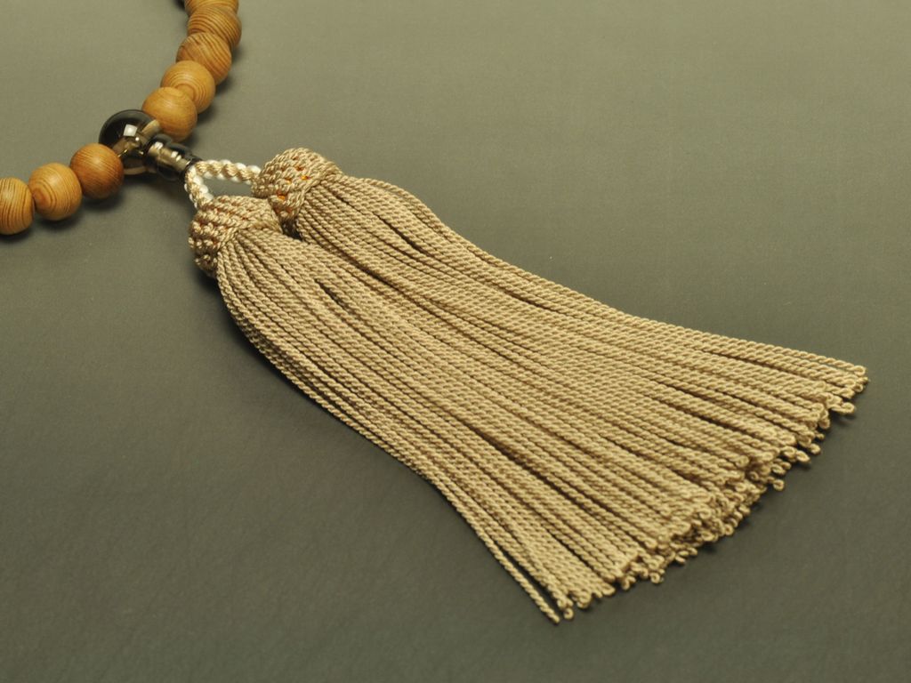 房は、濃いベージュ色の正絹頭付き房を合わせました。屋久杉、茶水晶にも合い、上品な感じに仕上がっています。