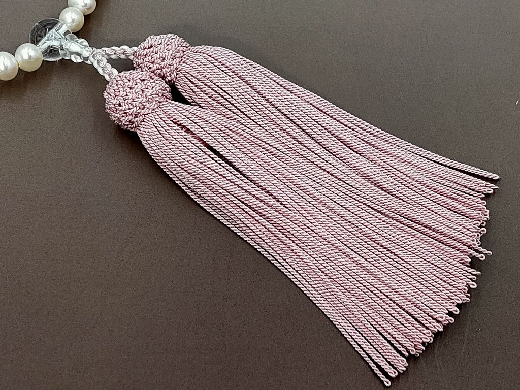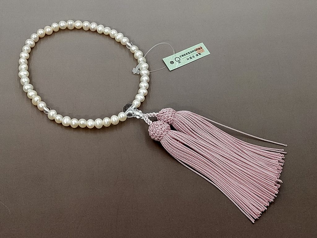 美しい淡水真珠で組んだ上品な女性用略式数珠です。主玉の淡水真珠は天然ゆえ、大きさに少々バラつきはありますが、きれいない色の玉を使っています。