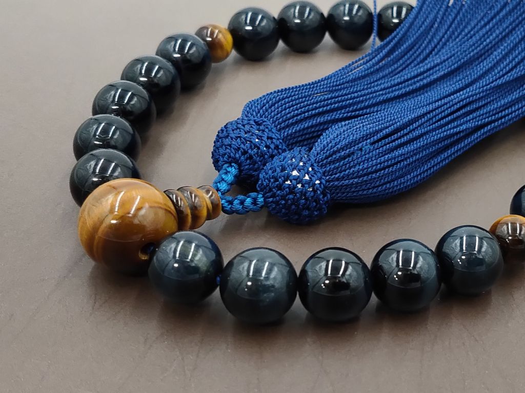 青虎眼石の主玉と、虎眼石で仕立てた男性用の略式数珠です。青虎眼石は紺虎眼石、またはホーク・アイ(鷹の目)等と呼ばれており、深い青色に輝く人気の数珠玉です。落ち着いた雰囲気と同時に、カッコの良い都会的な雰囲気もあります。