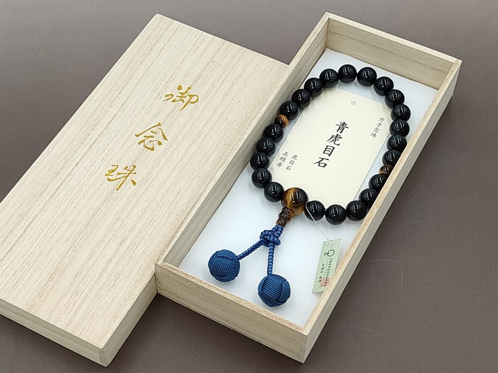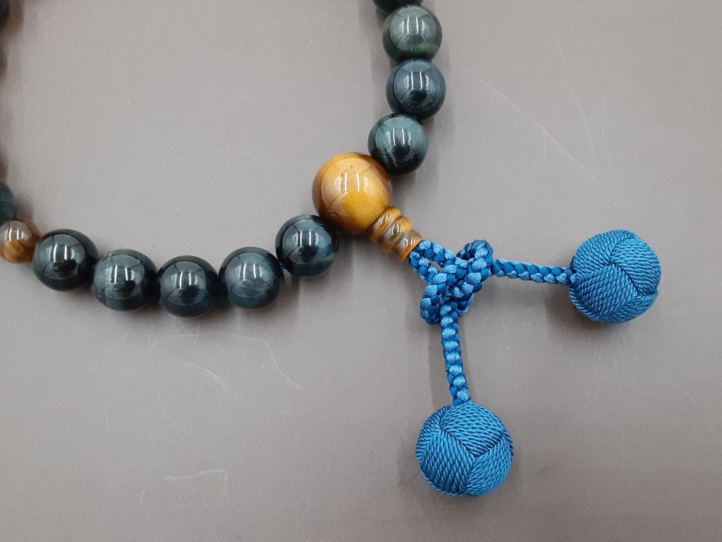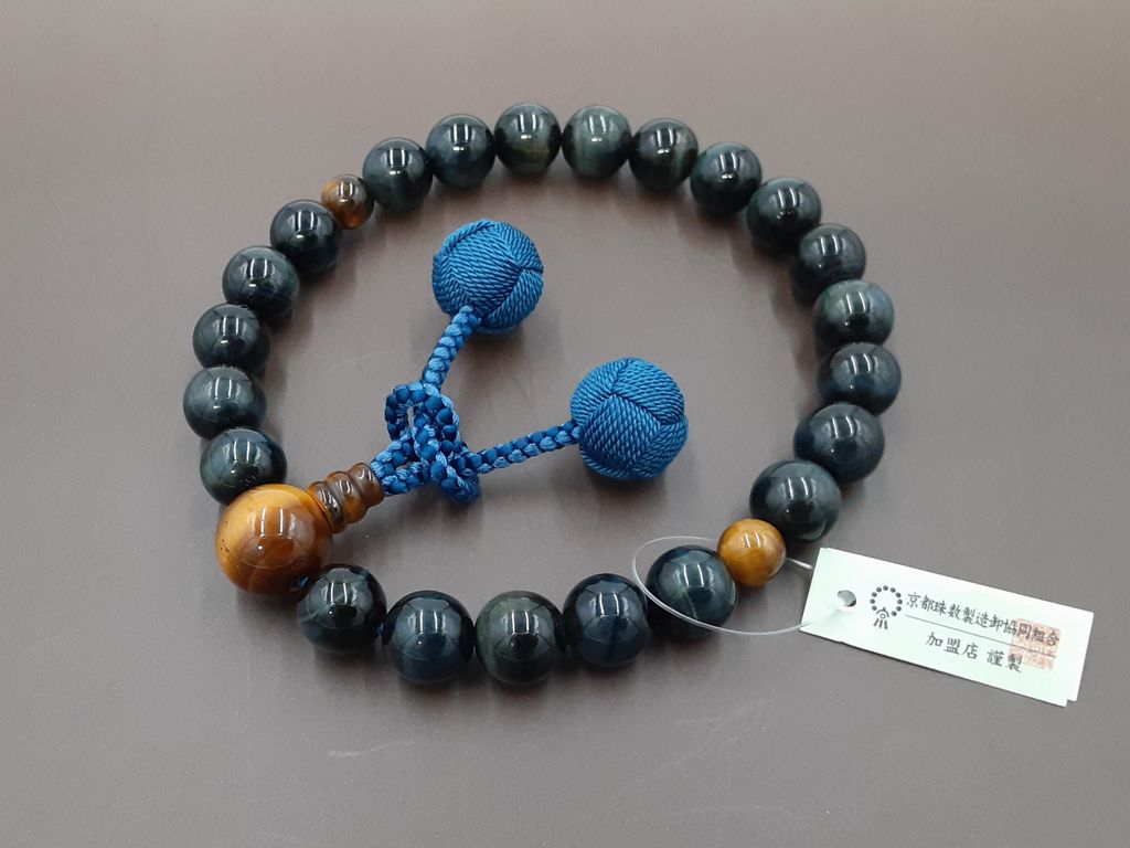 青虎眼石の主玉と、虎眼石で仕立てた男性用の略式数珠です。青虎眼石は紺虎眼石、またはホーク・アイ(鷹の目)等と呼ばれており、深い青色に輝く人気の数珠玉です。落ち着いた雰囲気と同時に、カッコの良い都会的な雰囲気もあります。