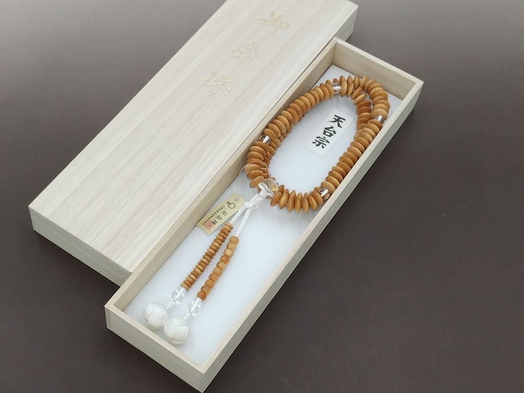 黄楊(つげ)と水晶を組み合わせた天台宗 女性用の本式数珠です。つげは、硬く強く、耐久性にすぐれた木です。古くから将棋の駒やソロバンの玉、くしや印鑑の素材として親しまれてきました。