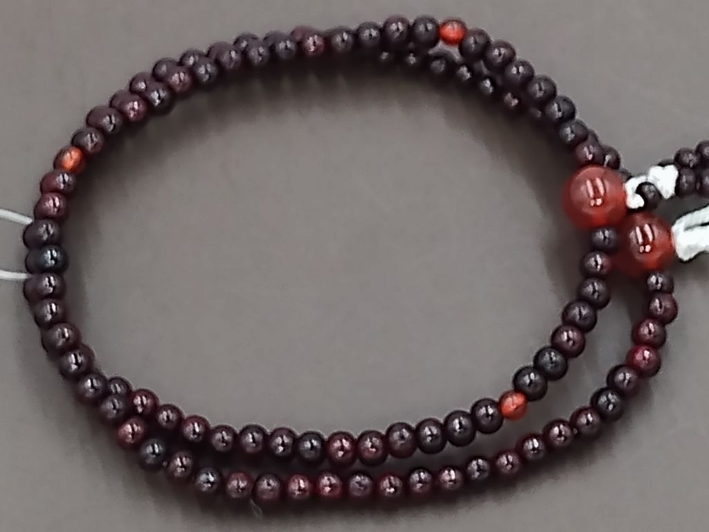 日蓮正宗 女性用の本式数珠です。珠は照り加工を施した紫檀に瑪瑙(めのう)を合わせています。
