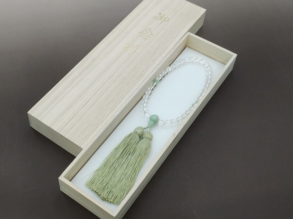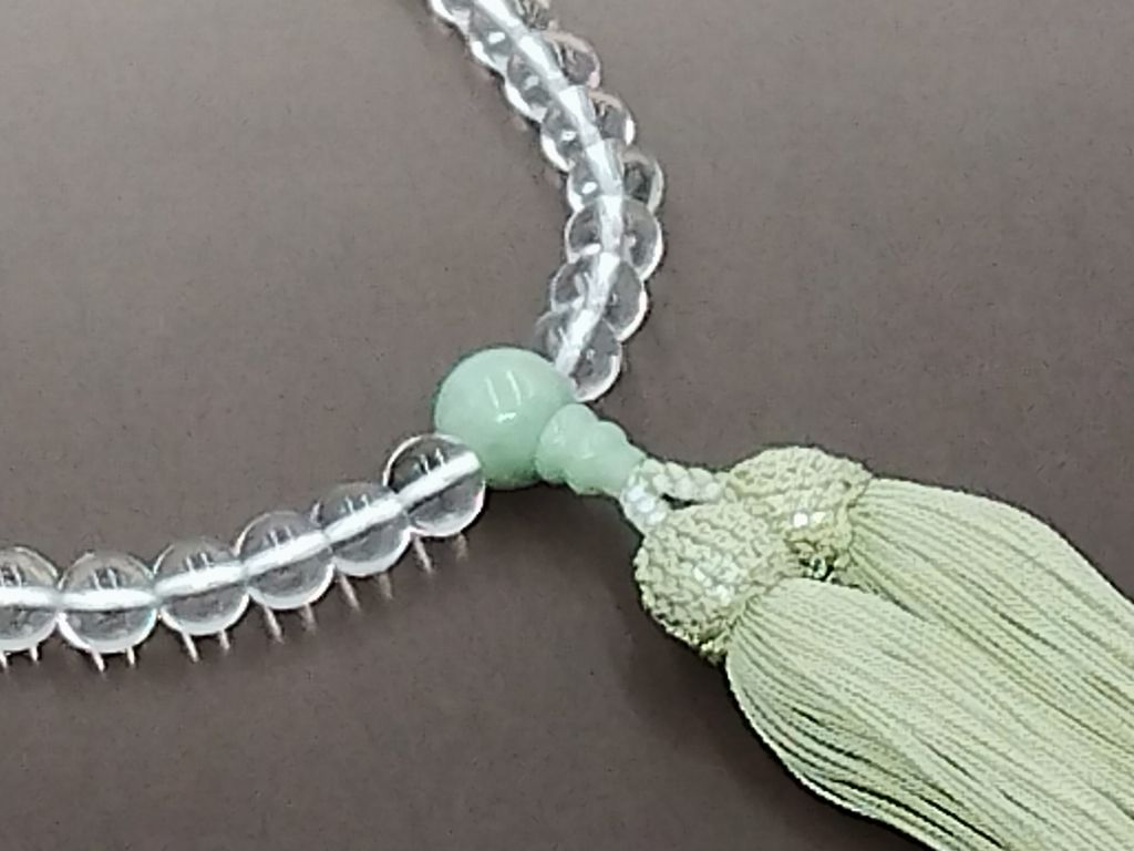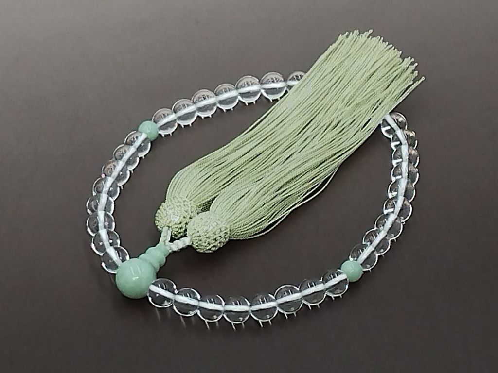 水晶と本翡翠を組み合わせた女性用の略式念珠です。主玉の水晶は8ミリ玉を使用しています。