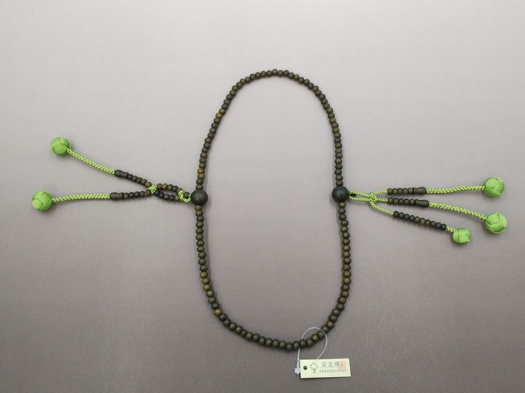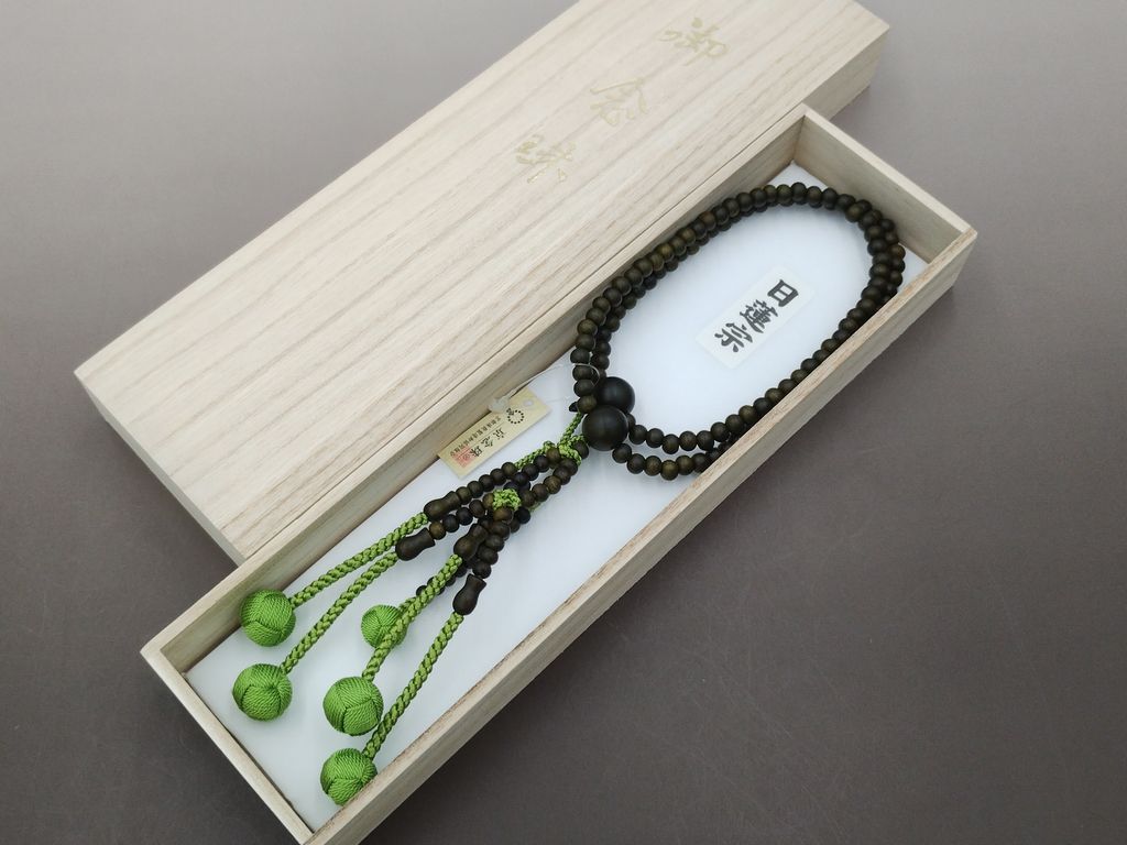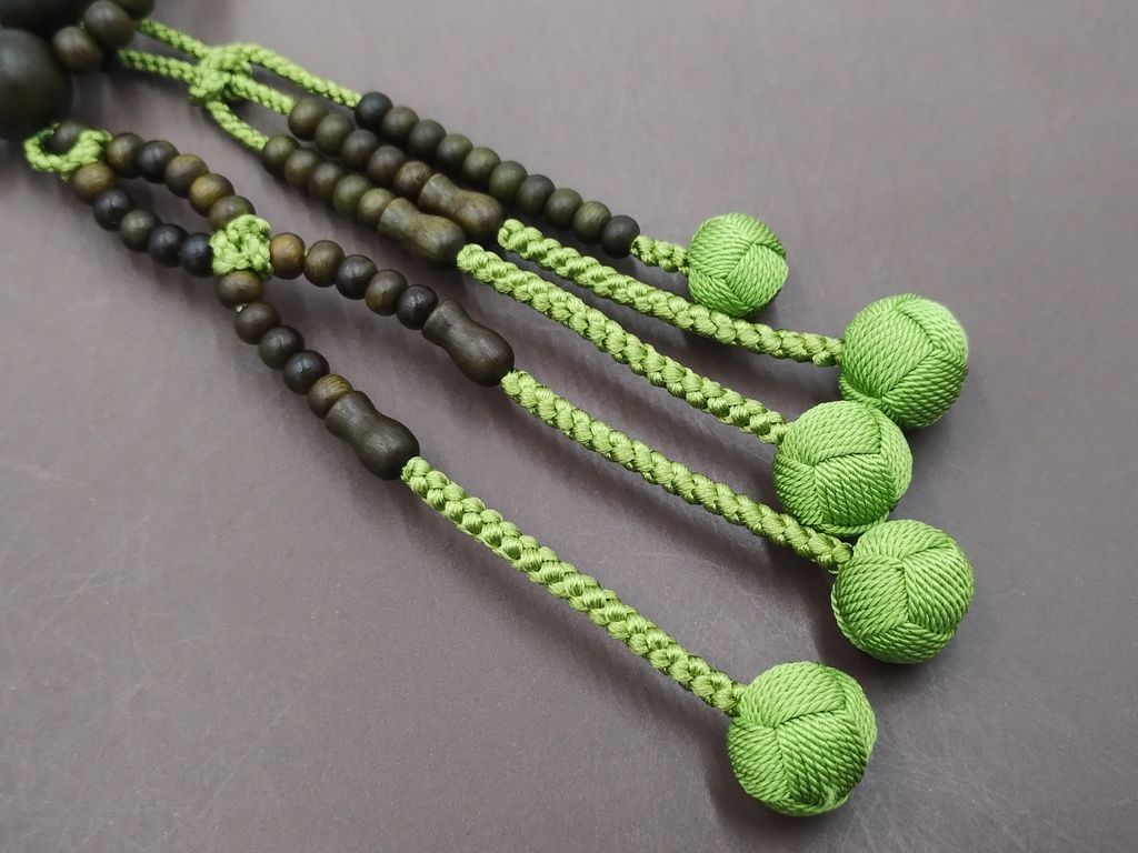 深い緑色の木の玉(緑檀)で組んだ日蓮宗の女性用本式念珠です。明るい緑色の柳色の房を合わせています。