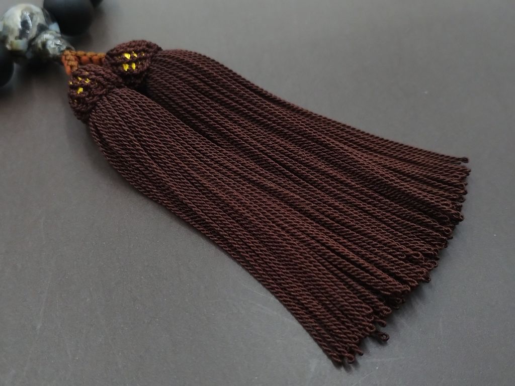 房は、桧(ひのき)の樹皮のような赤茶色の正絹頭付き房を合わせています。上品で落ち着いた感じに仕上がっています。