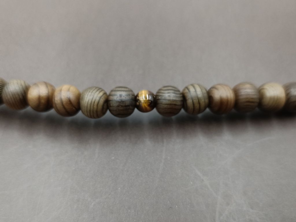 希少な神代杉と人気の虎眼石で組んだ曹洞宗(禅宗)の男性用本式数珠です。神代杉とは、天変地異などの原因で、長年地中に埋もれていた古い杉のことで、独特の色目が特徴の高級木材です。