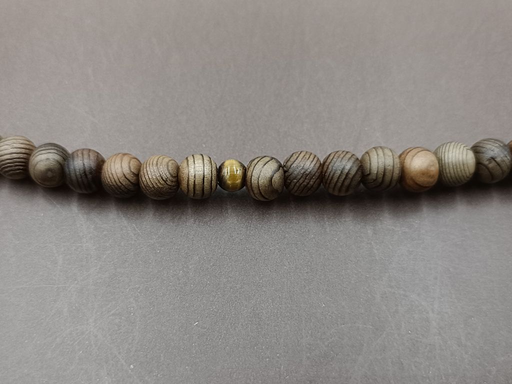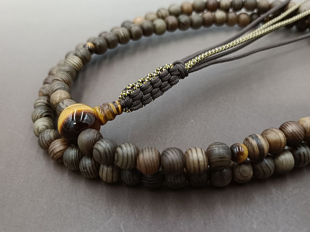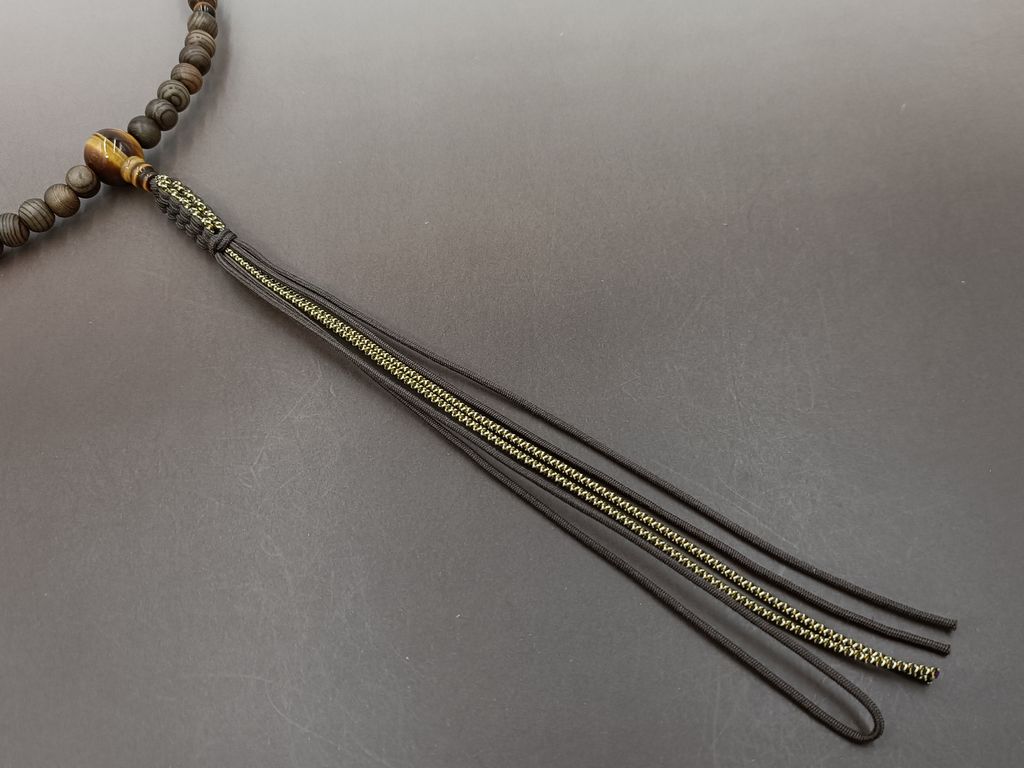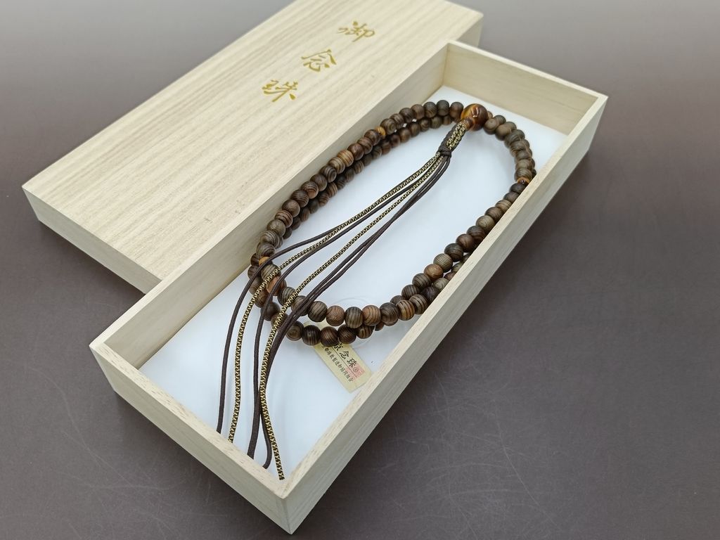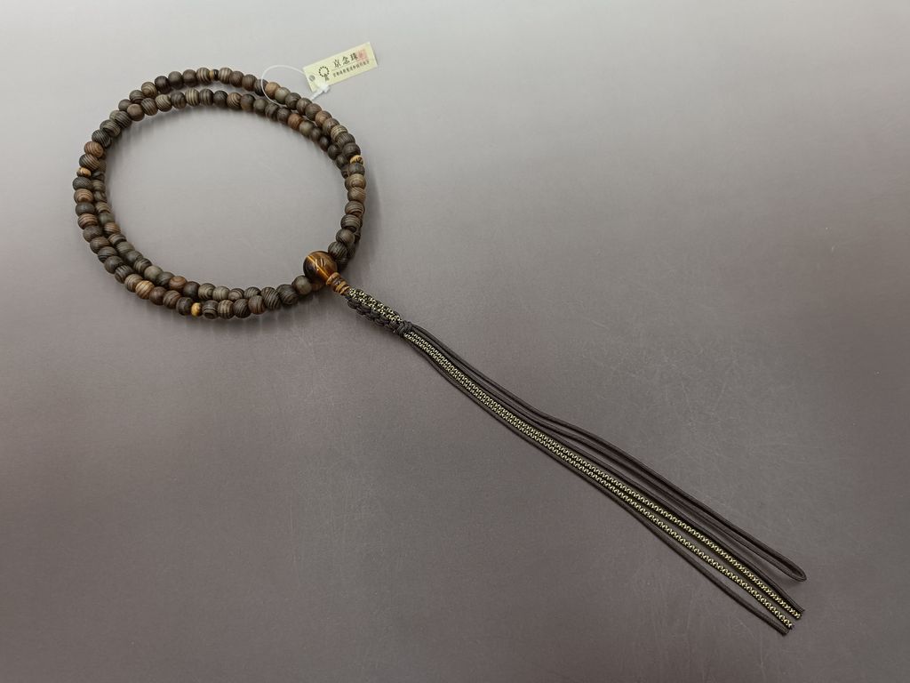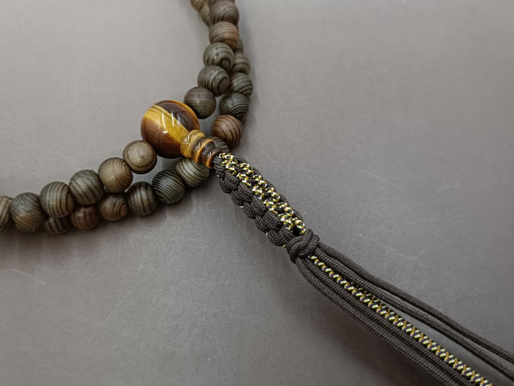 希少な神代杉と人気の虎眼石で組んだ臨済宗男性用の本式数珠です。神代杉とは、天変地異などの原因で、長年地中に埋もれていた古い杉のことで、独特の色目が特徴の高級木材です。