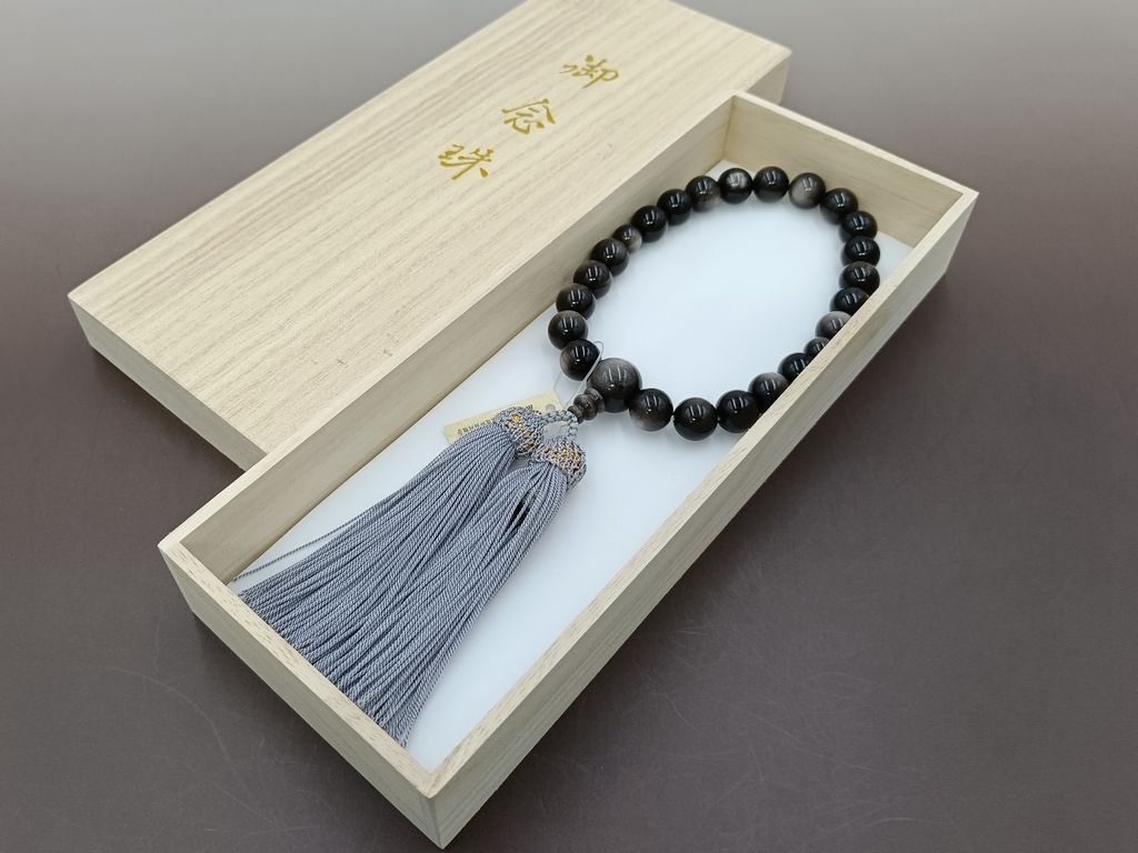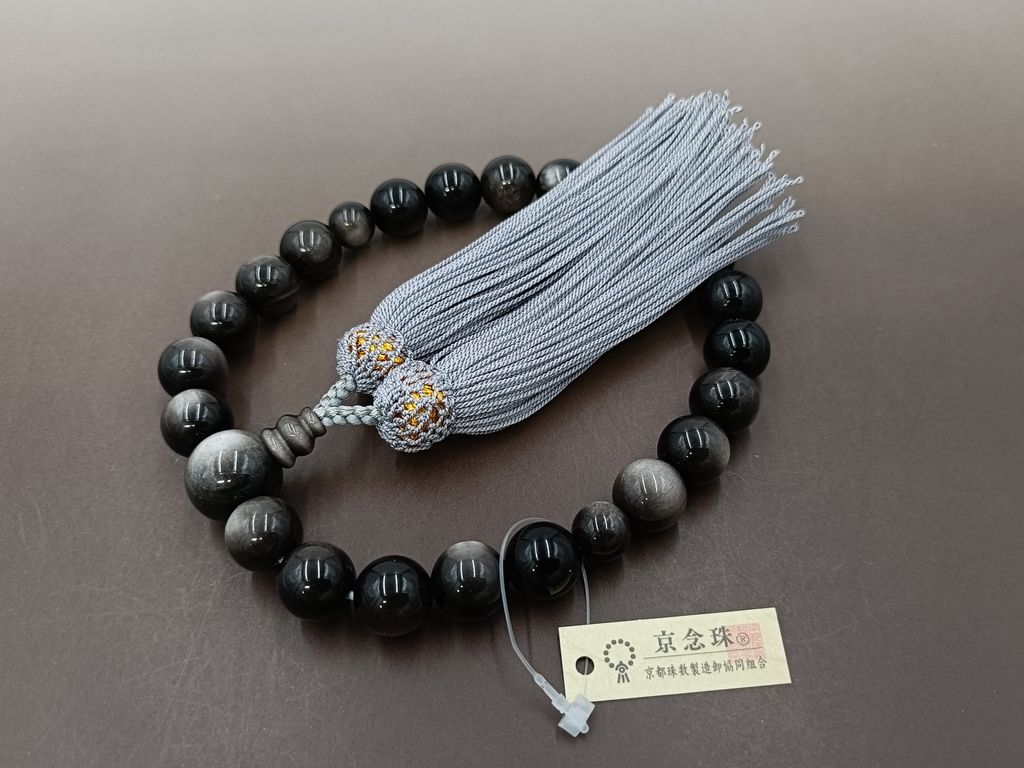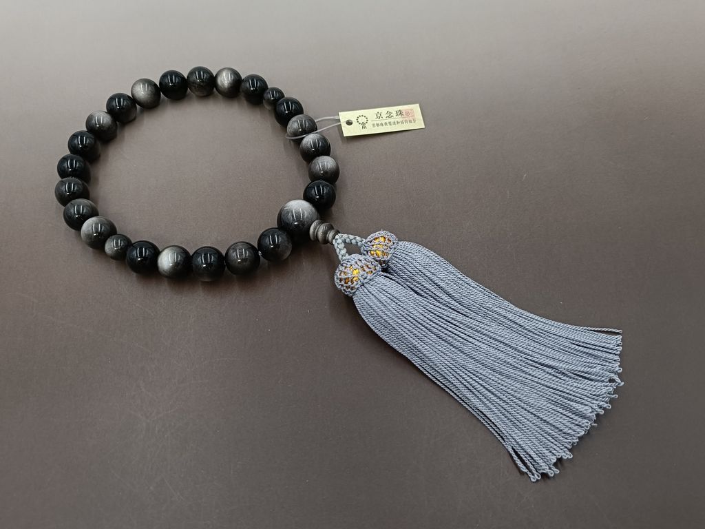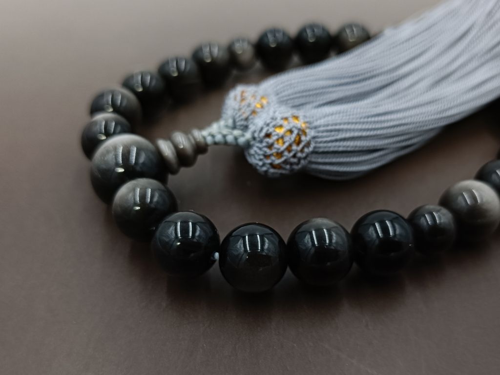 シルバーオブシディアン(銀黒曜石)のみで組んだ男性用数珠です。房色はグレーで、落ち着いた雰囲気に仕上がっています。