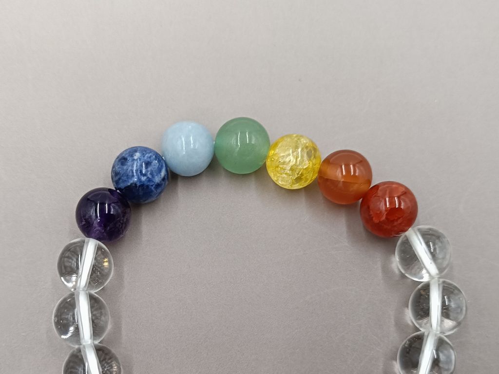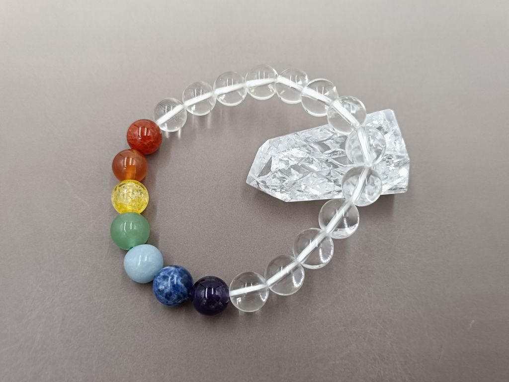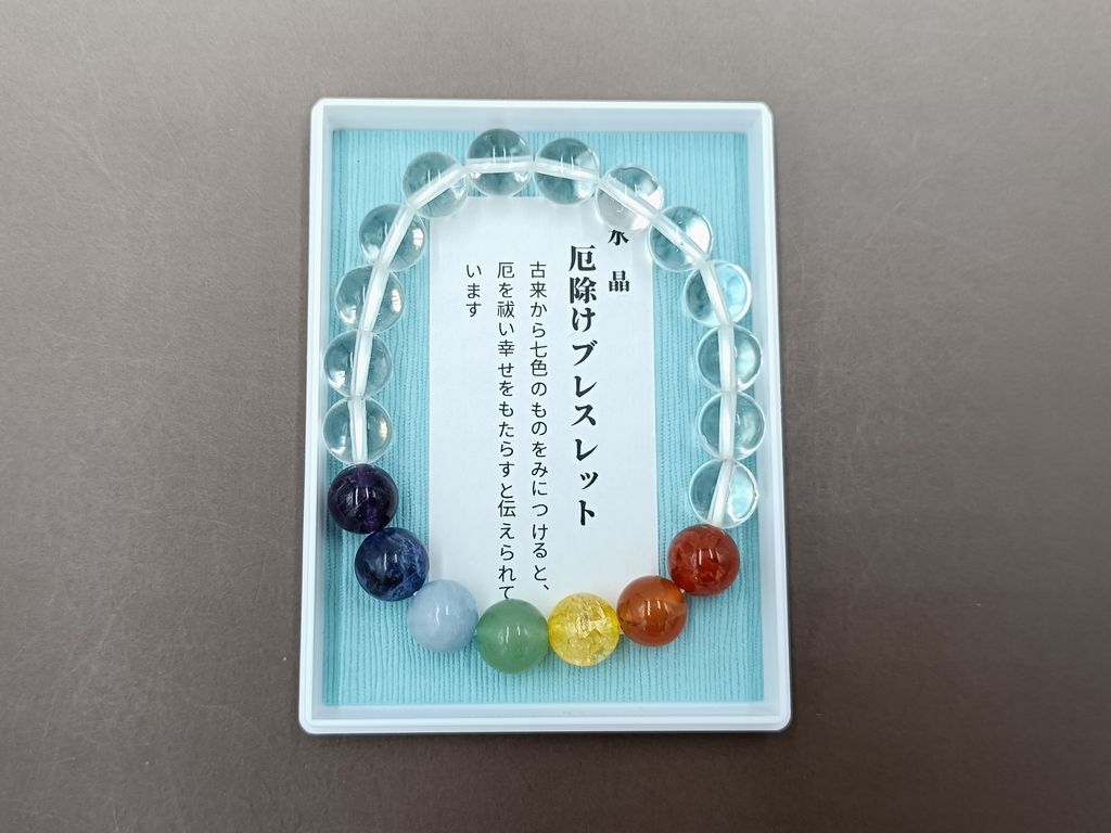 水晶と七色の石(カーネリアン,オレンジアベンチュリン,黄水晶,グリーンアベンチュリン,エンジェライト,ソーダーライト,紫水晶)を組み合わせた男女兼用の厄除けブレスレットです。古来から「七色のものを身につけると厄を祓い幸せをもたらす」と言われています。