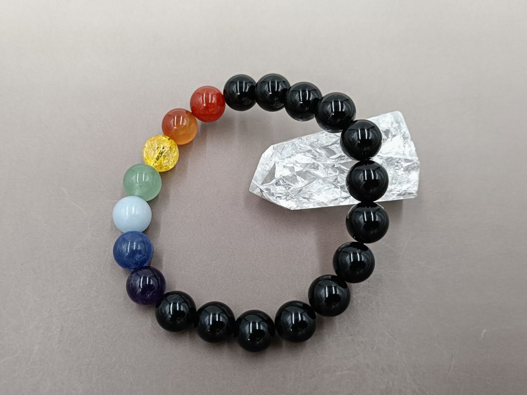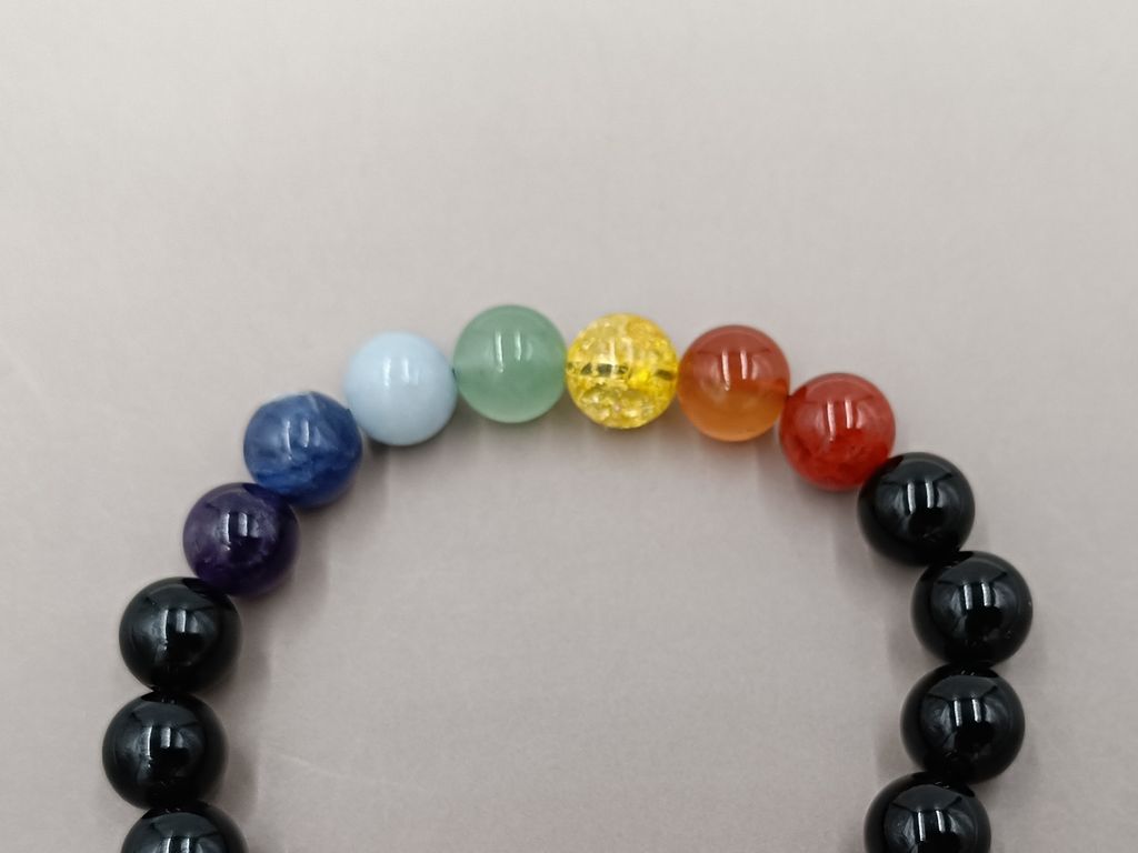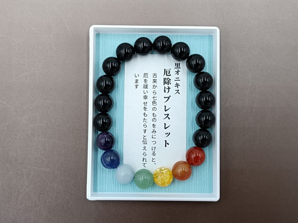 黒オニキスと七色の石(カーネリアン,オレンジアベンチュリン,黄水晶,グリーンアベンチュリン,エンジェライト,ソーダーライト,紫水晶)を組み合わせた男女兼用の厄除けブレスレットです。中糸はシリコンゴムを4重に通し、耐久性を高めておりますが、入浴や水仕事時に着けっぱなしすると、水分によりゴムの劣化を早める可能性がありますのででご注意ください。