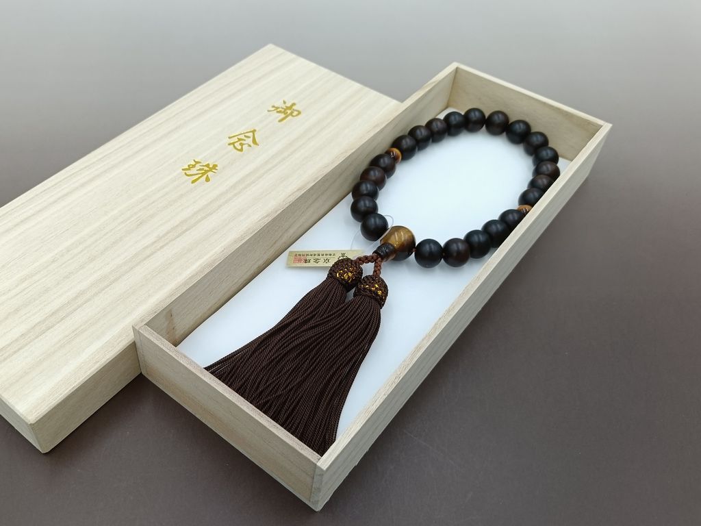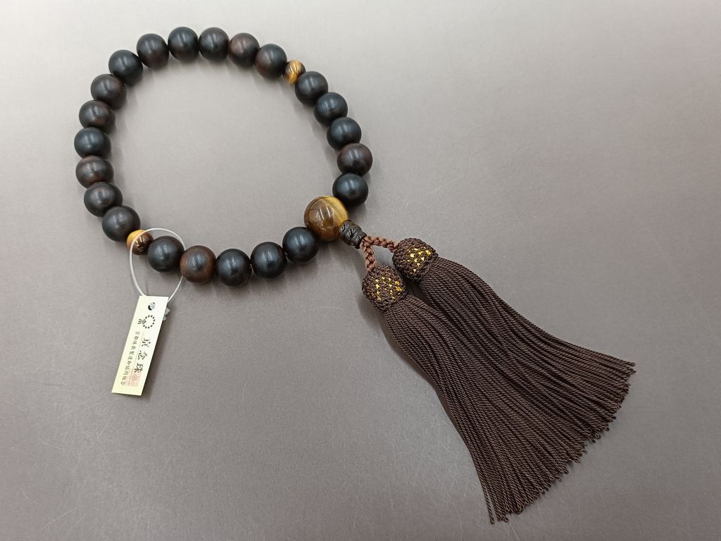 虎眼石と縞黒檀の組み合わせは、非常に人気の高く、玉のグレードも並み以上で組んだお買い得な男性用略式数珠です。職人が真心を込めて組んだ良品です。