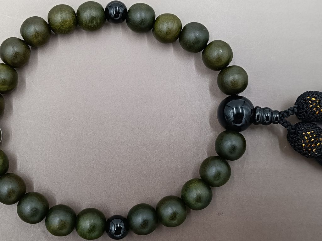 緑檀の主玉と、ブラックオニキスで仕立てた数珠です。緑色の緑壇は、落ち着いた色合いで、写真の色合いよりも若干暗めですので、派手過ぎることはありません。