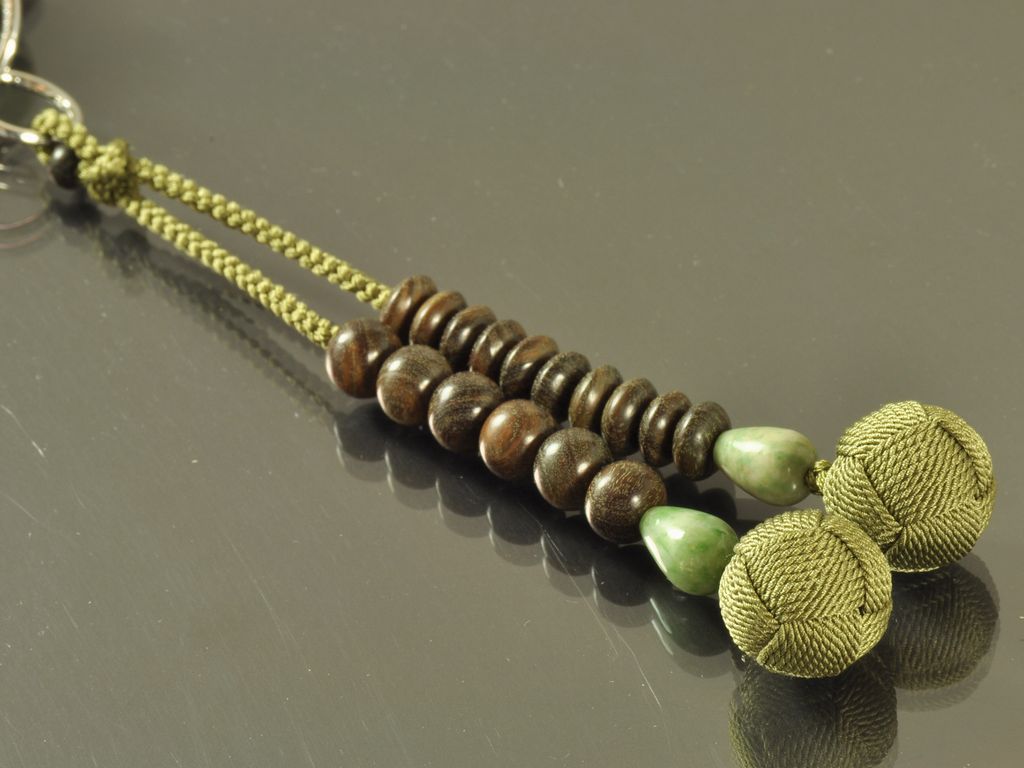 浄土宗・男性用の本式数珠。珠は独山玉と緑壇仕立てです。房は深草色の梵天カガリ房です。