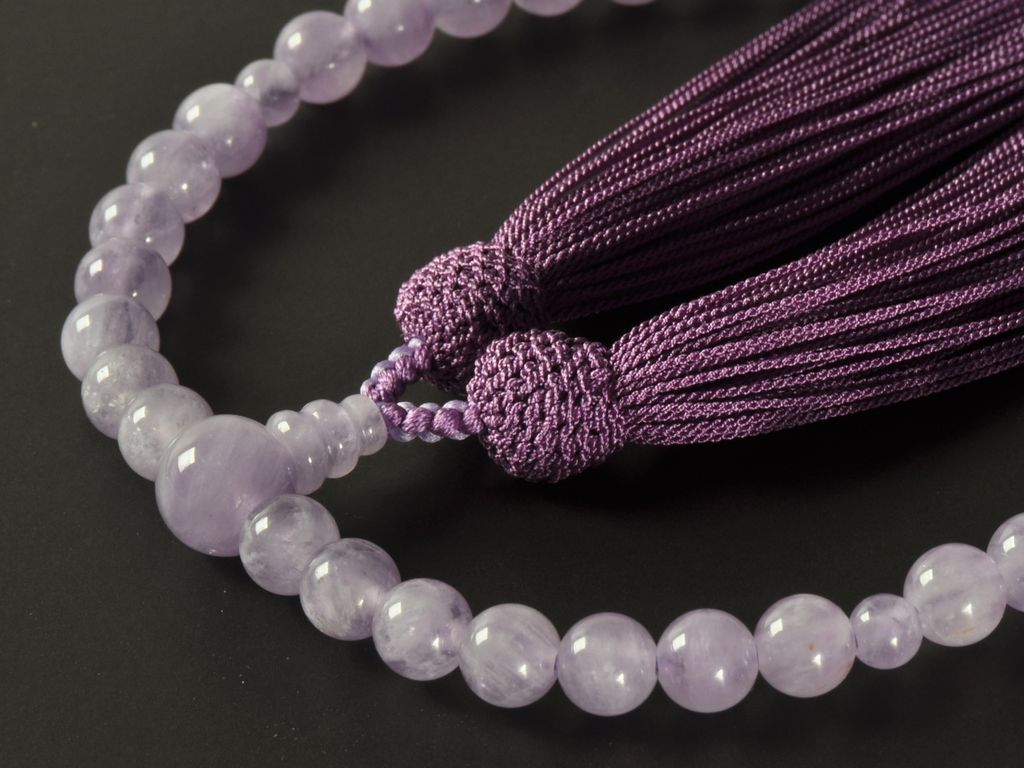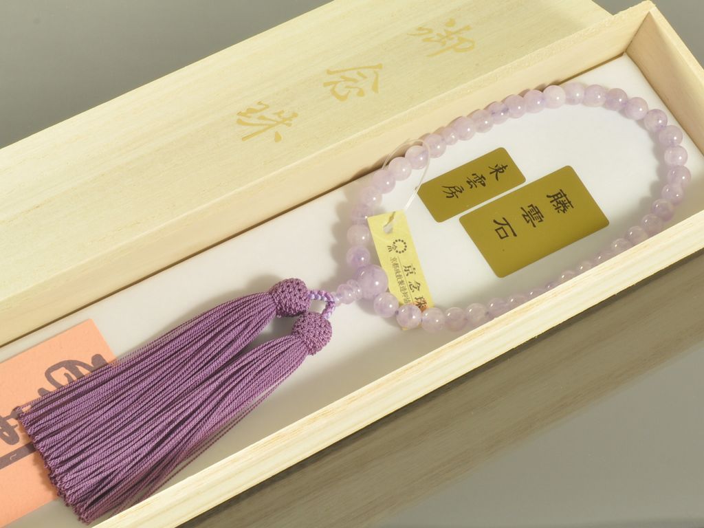 雲のように美しい紫色に曇った藤雲石で組んだ女性用略式数珠です。房は葡萄色で上品な印象を与えると、ご好評いただいております。