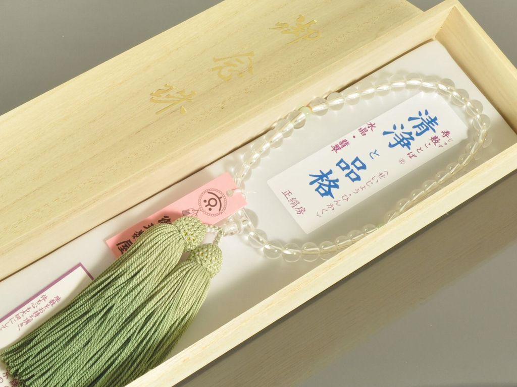 水晶をメインに翡翠(ヒスイ)を二天玉に配した女性用の略式数珠です。宗派は問わずにお使いいただけます。