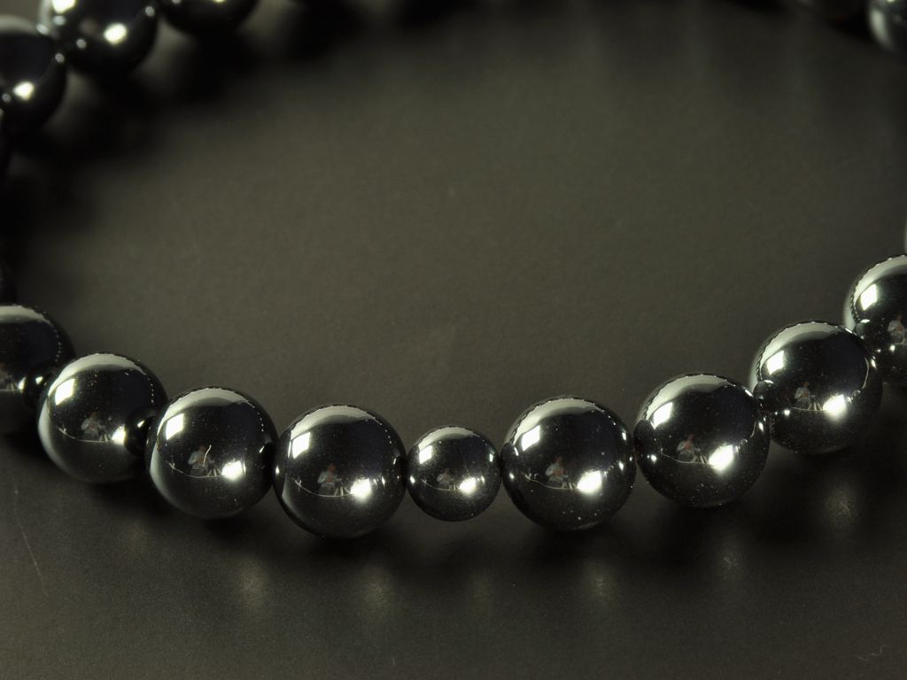 和名は赤鉄鉱。磨かれたヘマタイトはシルバーに鏡のような光沢を持ちます。金属調の光沢が人気の石で、他の石に比べ圧倒的な重みがあります。原鉄を含みます。数珠の玉には関しては磁気のないものを使っています。
