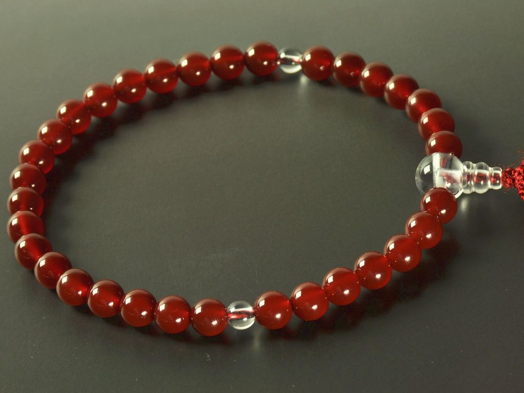 大粒の赤い瑪瑙と水晶で組んだシンプルで親しみやすいお数珠です。年齢を問わずに無難で使いやすく、新社会人の方など、お若い方が初めて持つお数珠としてもお奨めの品です。