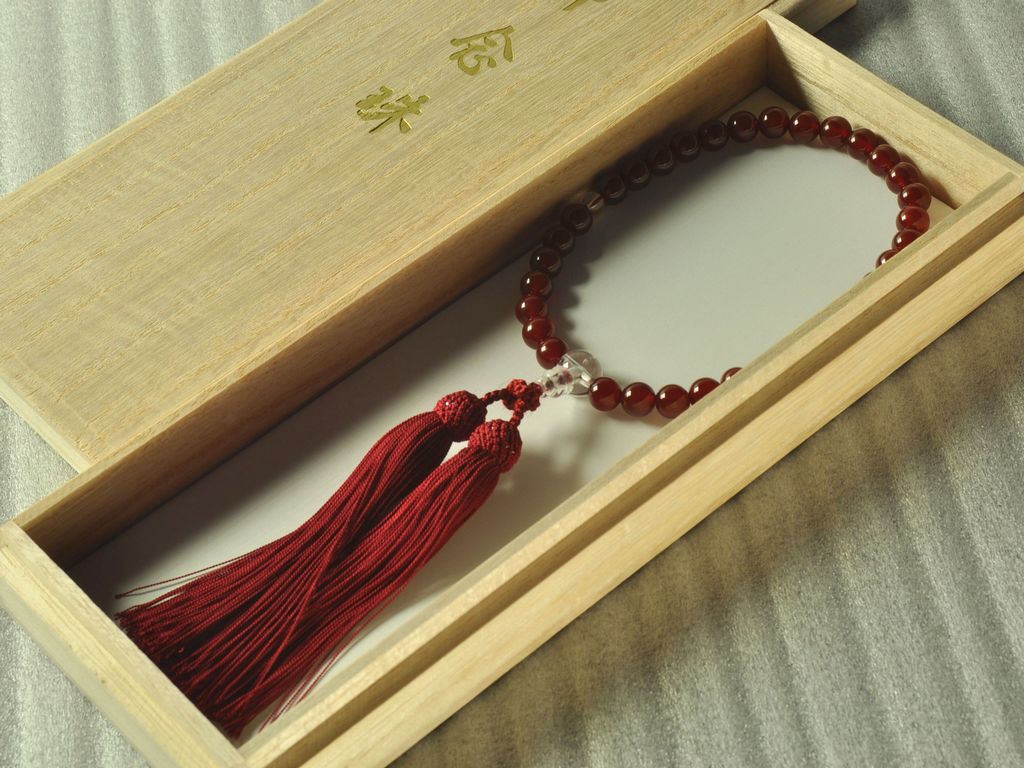 数珠の紐は、簡単に切れるようになっておりませんが、大切にお使いいただけますように、お願いします。詳しくは、 数珠・念珠とはのページへ