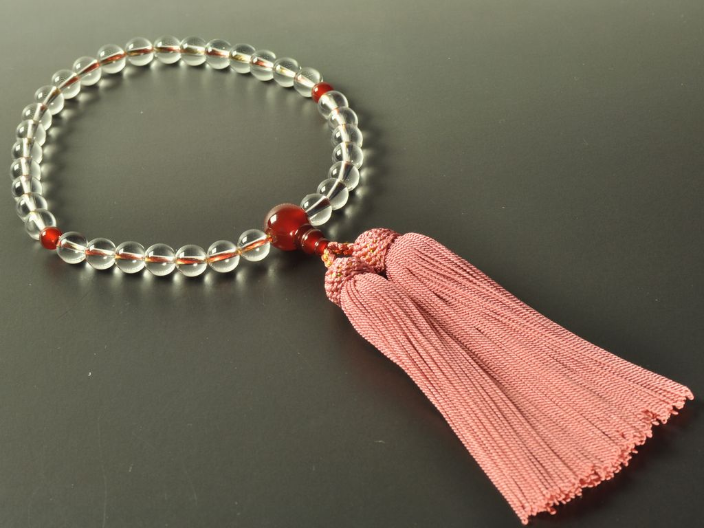 水晶(8mm) 瑪瑙 光輝京錦通し紐 正絹頭付き房(薄紅色) 女性用略式数珠