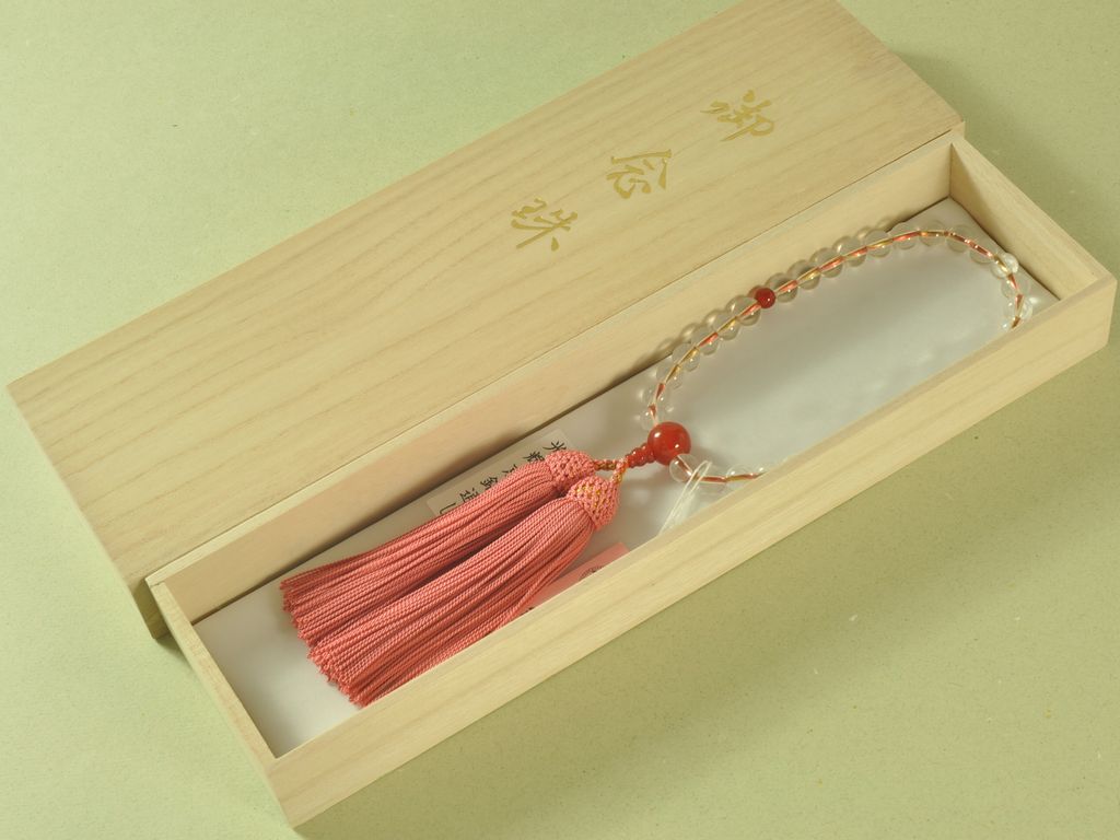 全体的に明るめのデザインに仕上げた女性用略式数珠です。水晶と瑪瑙の組み合わせは良くある組み合わせですが、中通しに光輝京錦という赤と金色が入った絹の糸を通しており、綺麗なアクセントになっています。