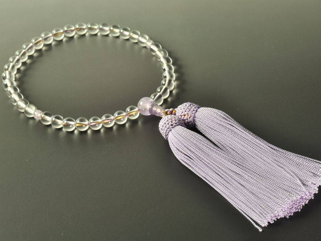 主玉のサイズは7ミリで女性用数珠の標準的なサイズ。水晶と薄い紫色の藤雲石を合わせた上品な女性用の略式念珠です。