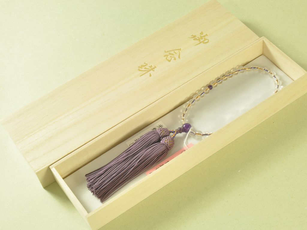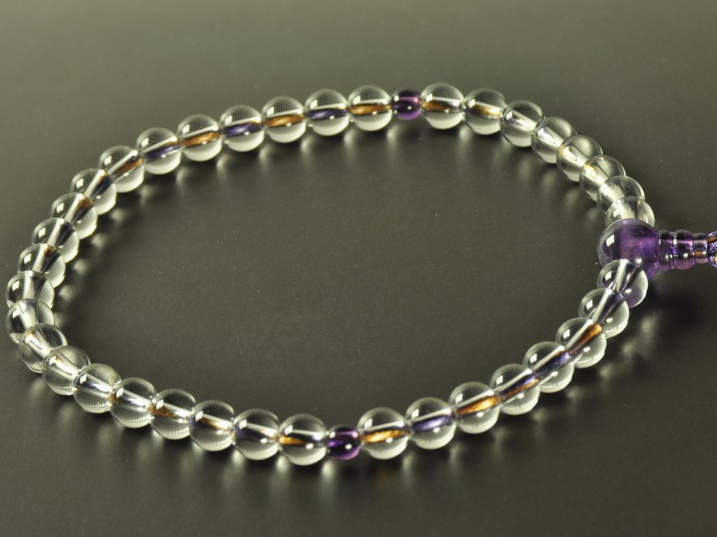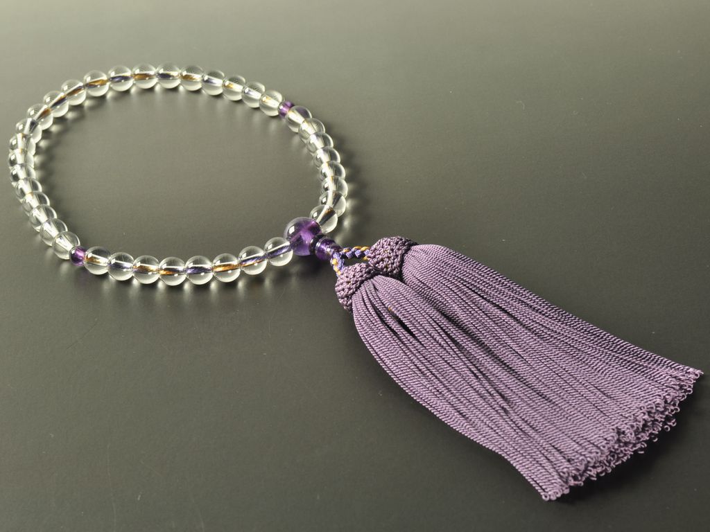 主玉のサイズは7ミリで女性用数珠の標準的なサイズです。水晶と紫水晶を合わせた上品な女性用の略式念珠です。