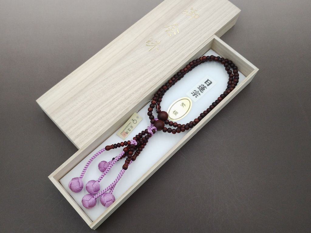 日蓮宗・女性用の本式数珠です。房は正絹の梵天房で、アヤメ色という、落ち着いたピンクです。石の玉は使わず、紫檀だけですので、価格もその分お求めやすくなっています。幅広い年代にお使いいただけますが、特にお若い方が最初に買われる法華のお念珠という位置づけです。