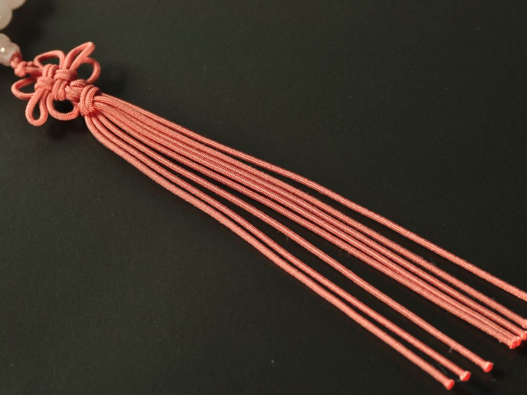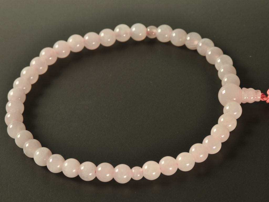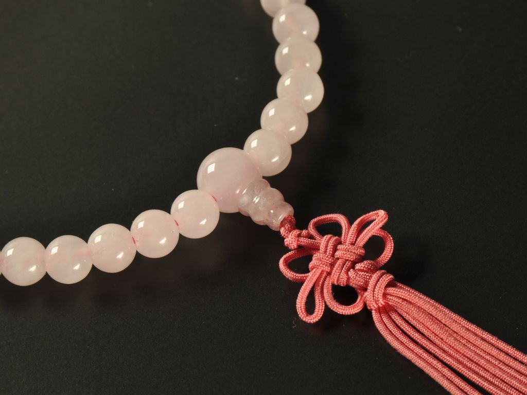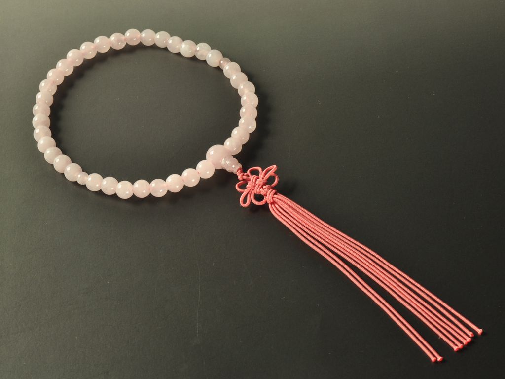 お子様用(女子)のお数珠です。玉はローズクォーツのみで組んでいます。房に花形の結びの紐房を合わせています。