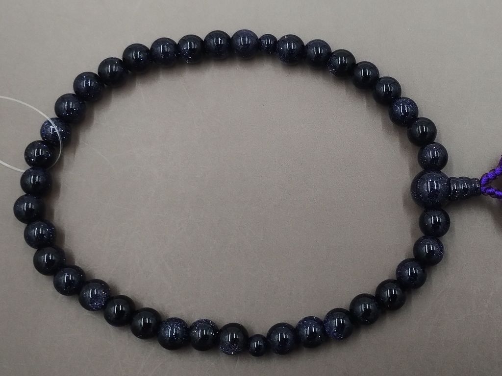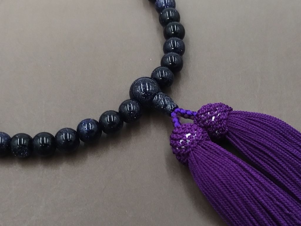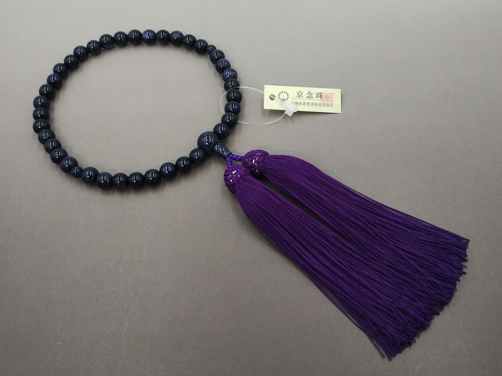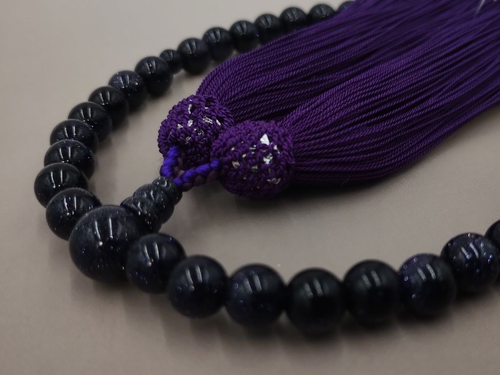 濃い藍紺色の中にキラキラと結晶が輝く紫金石で組んだ女性用のお数珠です。夜空に星屑を散りばめたような表情はたいへん美しく、上品な印象を与えます。