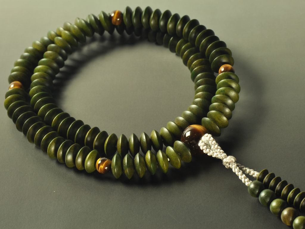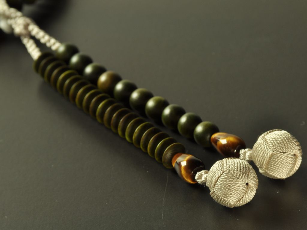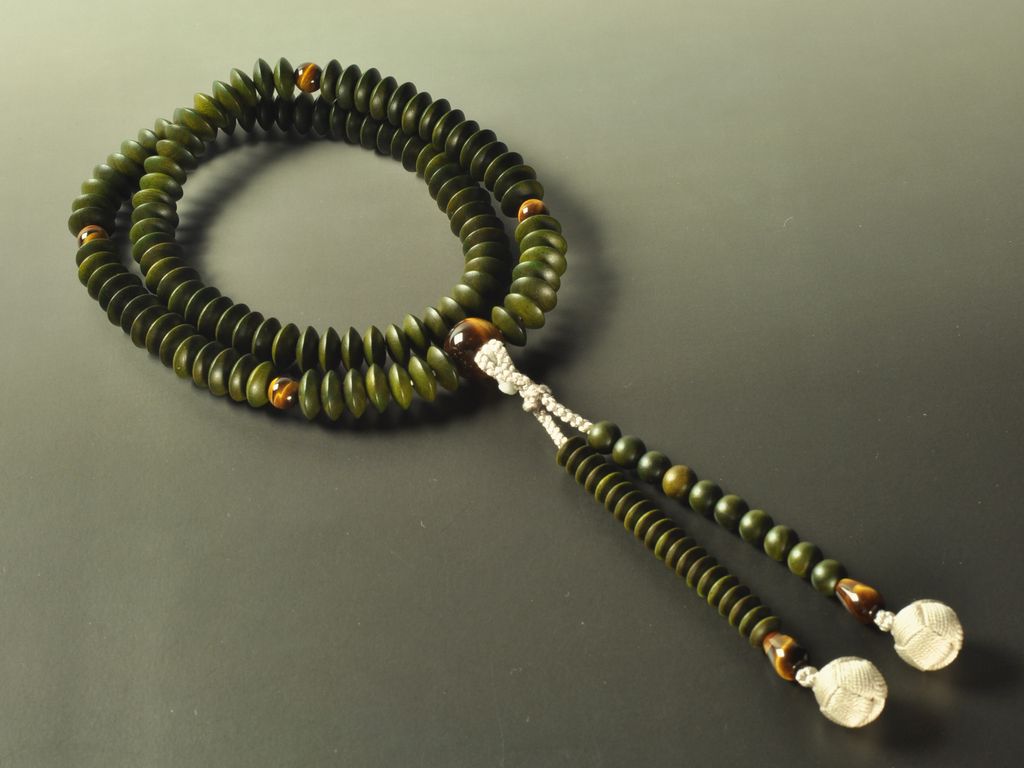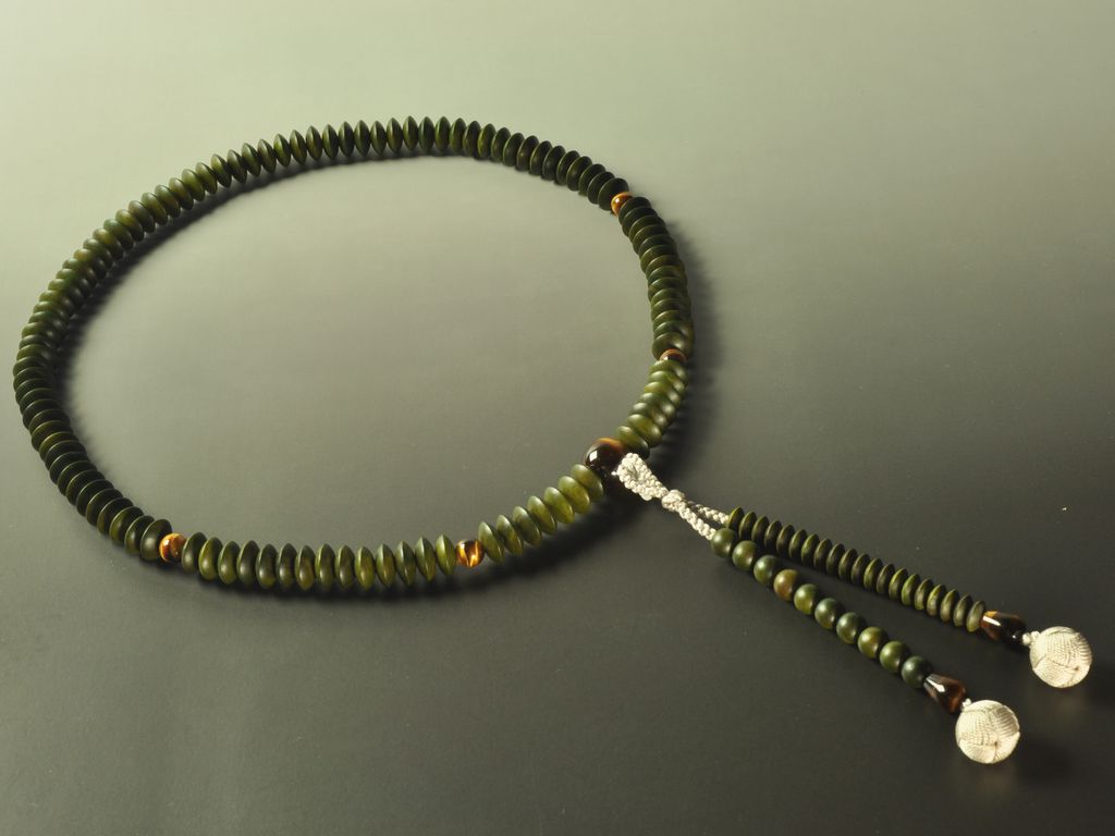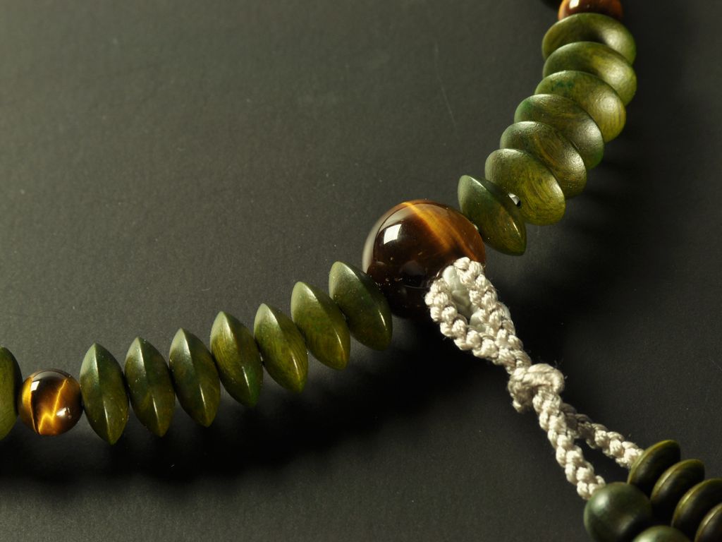 緑檀と虎眼石の天台宗男性用の本式数珠です。京念珠の職人が丁寧に手作業で仕上げた品です。