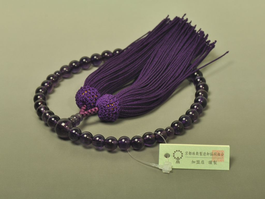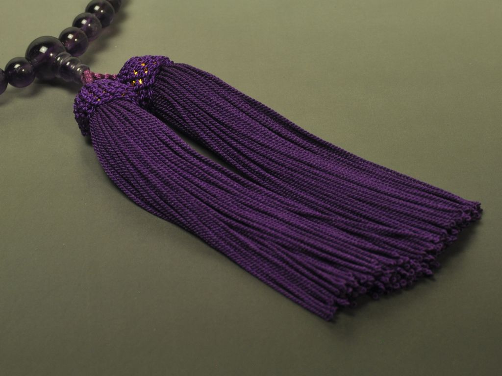 紫水晶だけで組んだ女性用略式数珠です。価格を抑えるため、玉のランクをやや落としていますが、紫水晶と野菜のナスのような濃い紫色の房で、紫色の好きな方にはお奨めの一品です。