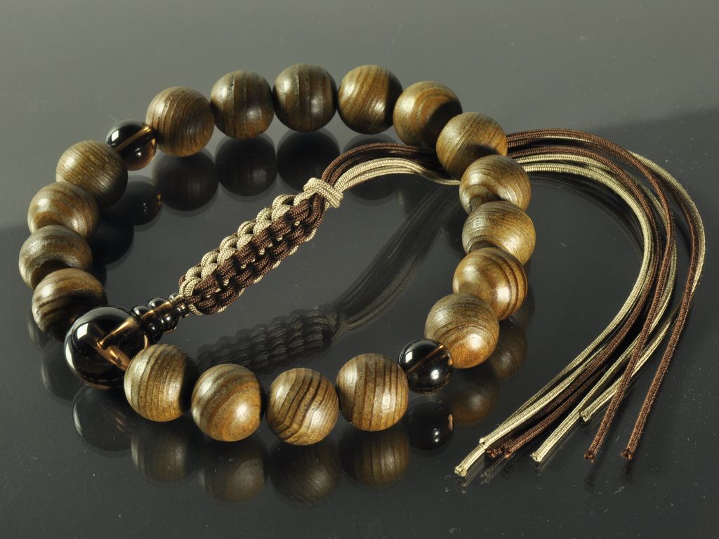 神代杉とは、天変地異などの原因で、長年地中に埋もれていた古い杉のことで、独特の色目が特徴の高級木材です。茶水晶と合わせることで、渋めの数珠として仕上がっています。