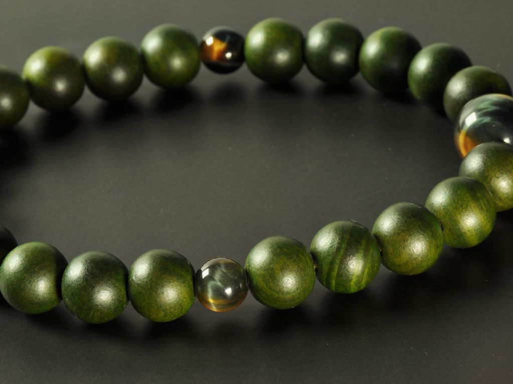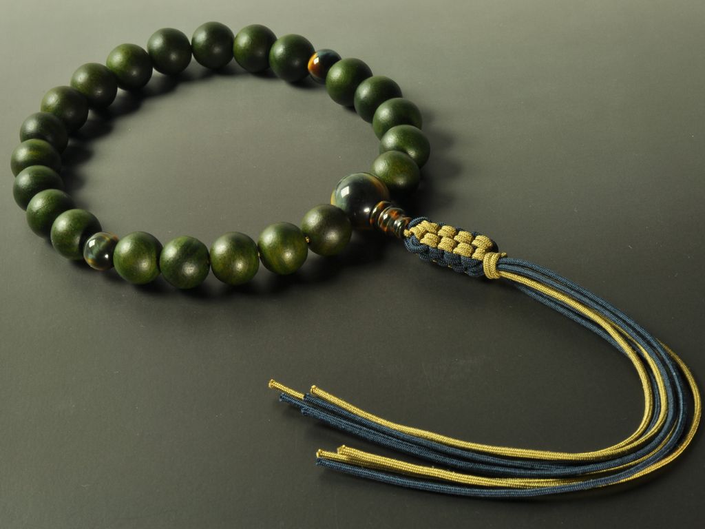 緑檀の独特の緑色に、混虎眼石を合わせた浄土真宗の男性用数珠です。当店で販売する中でも人気の品です。