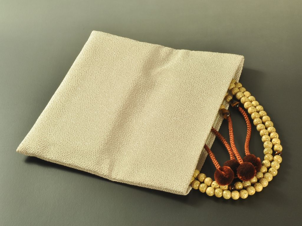 水に強いちりめん生地(ベージュ色)のシンプルな数珠入れです。「六地蔵信仰」は六道のどこへ行ったとしても、地蔵菩薩が全ての責めを負い、救済してくださるというものです。