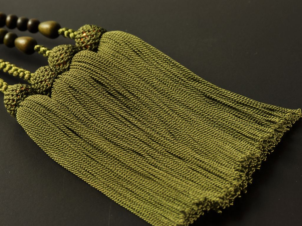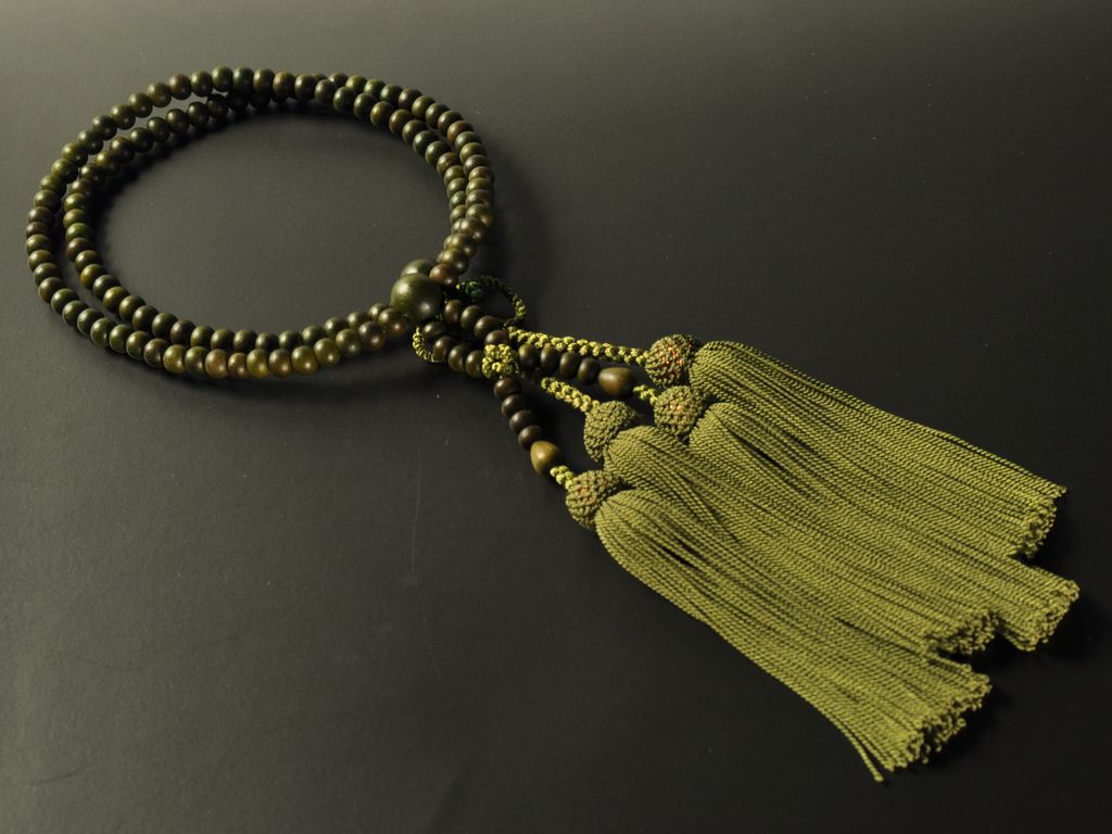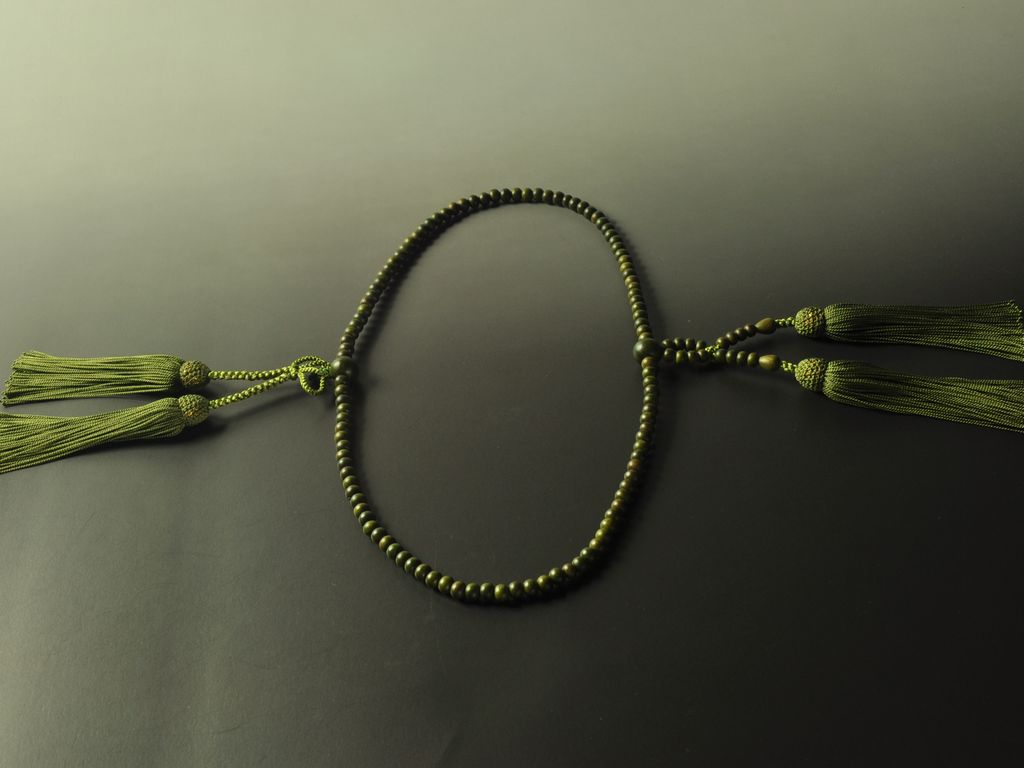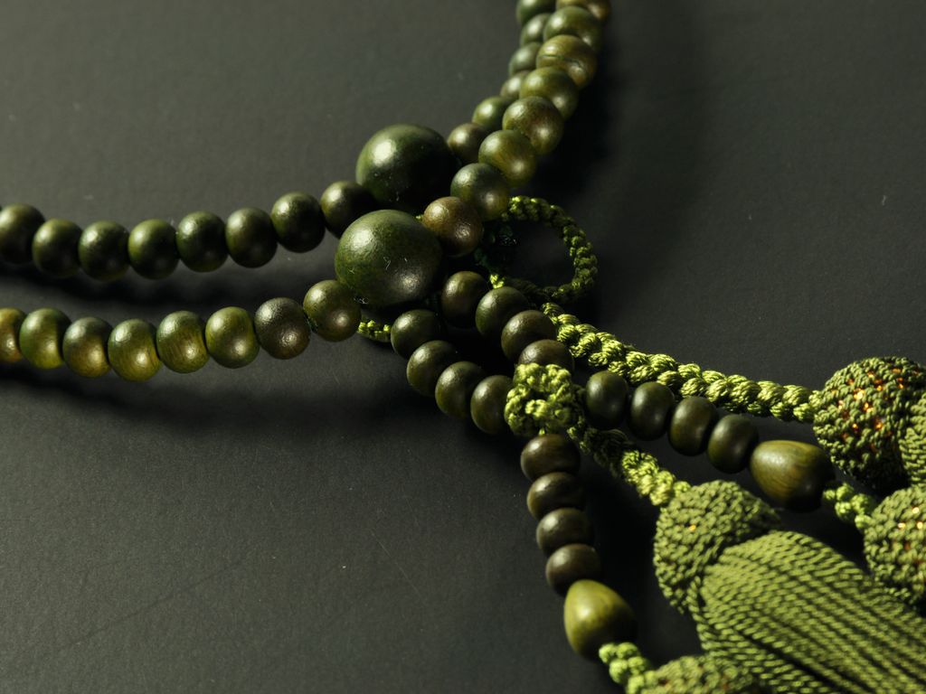 深い緑色の木の玉(生命の樹)で組んだ浄土真宗(門徒)の女性用本式念珠です。独特の緑色が特徴的です。房も緑系の柳色を合わせ、緑で統一しています。